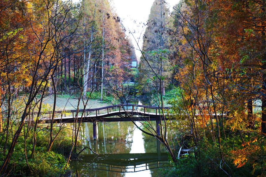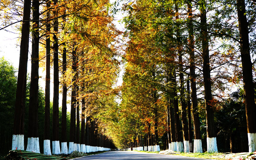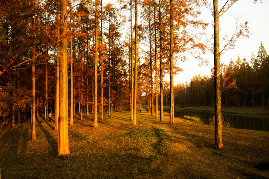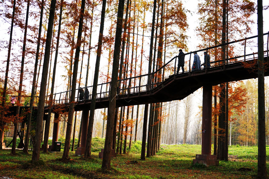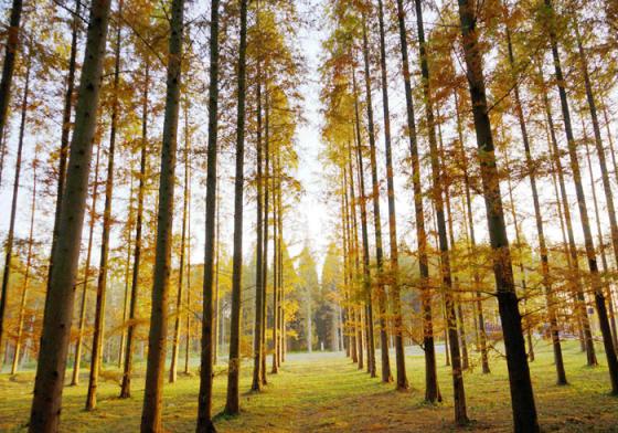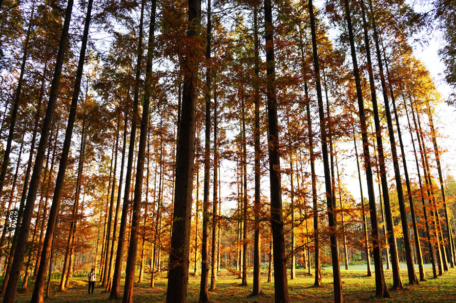 树树皆秋色,山山唯落晖。用这句诗来描述这里的景致在适合不过了,步道下面和树木间落满了一地的松针,公里的森林景观长廊—杨树长廊、水杉长廊、银杏长廊、竹林长廊让人欢喜不已。