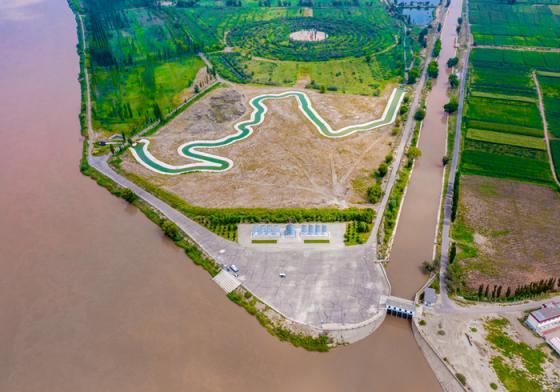 黄河水坛是三盛公风景区历时三年打造的人文景观。水主智,孕育生命万物。水坛由三层平台组成,底层平台直径339米,总长度为9999米的水道组成八卦水域迷宫,游客要想登临水坛顶层,必先破此迷宫。