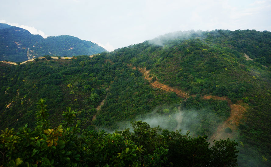 视线的左前方是一段古老的长城,掩映于草木之间,绵延在层峦的尽头。据说车神架古长城与唐山遵化县内的长城连接,全长41公里,车神架景区内的古长城处在中部,一共有7段,总长约十余公里,据说是戚继光任职黄崖关提督衙门总督期间修筑,具有很高的研究和开发游览价值,远远望去,历史沧桑之感油然而生,由于地势险要,山遥路野,原本想爬上去的念头只好打消。