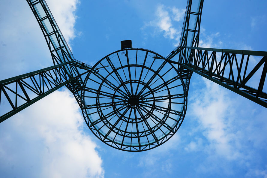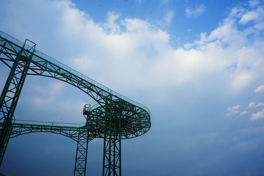 最亮眼的当然是云台山顶的高空玻璃观景台(正在向全国征集项目名称),远远望去,平台呈几何形状,巍然矗立于峡谷和高山之间,观景台上下廊道均由玻璃铺就,与山谷最大落差达到了400米,踏上去,悬空的感觉直逼人心,胆小的人几乎不敢前行;而对胆大的人来说,这当然是一次有惊无险的悬崖云端漫步。