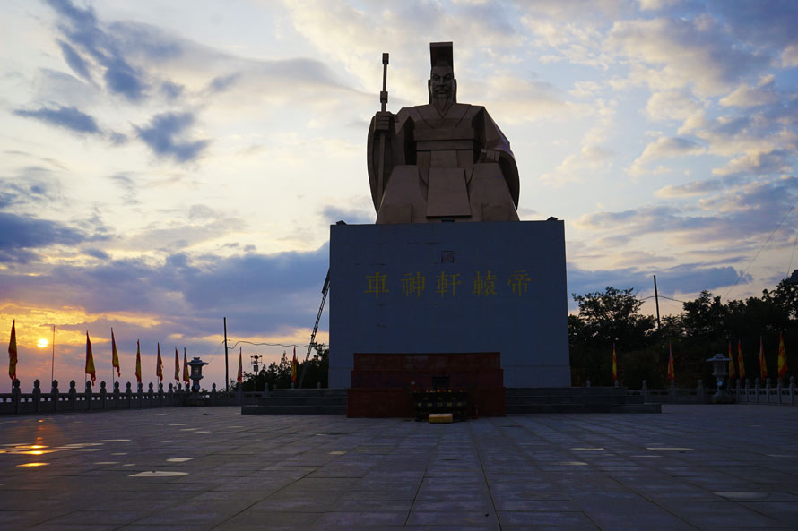 与玻璃观景台遥相呼应的是轩辕坊,入口处的石牌坊之上书写这“轩辕圣境”,背面也题有四个大字“紫气东来”。过轩辕坊向前走,就步入了车神大道,前方平台之上是一尊车神轩辕大帝的圣像,据说这是全国最大一处轩辕像,寓意大吉大利、出行平安。