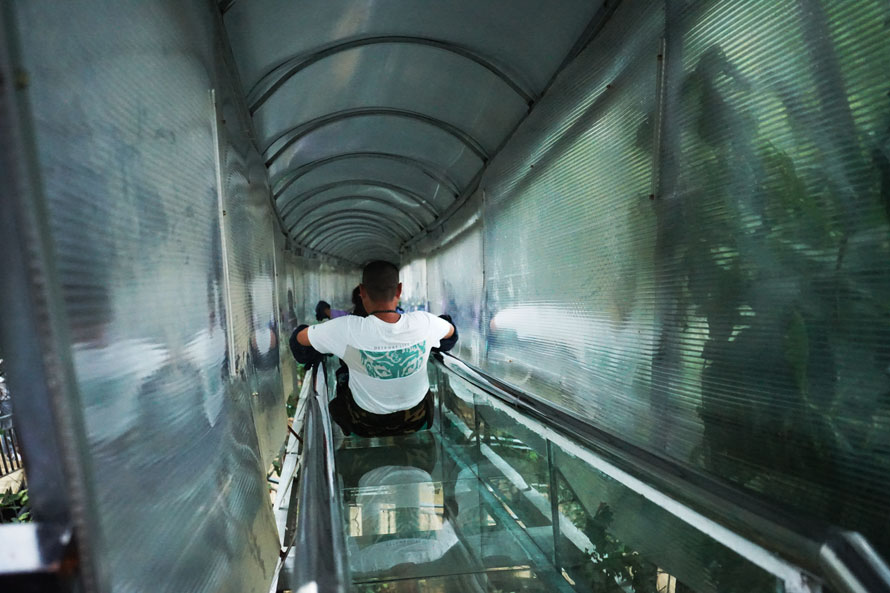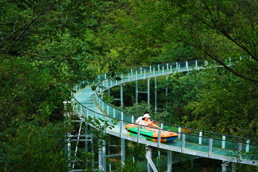 下山的时候最好选择步道,沿途林木避天,当然也可选择一段旱滑,滑道由高山之上逶迤而下体验一把高山速滑的乐趣;步道中途还有一处玻璃水滑,整个滑道由玻璃铺成,层层盘旋在峡谷崖璧,玻璃道上一层流水,游客坐的皮艇里,顺流而下,峡谷山涧的美景在两侧乎乎而过,节省了下山的体力,欣赏了峡谷的美景,又体验了水滑的魅力。