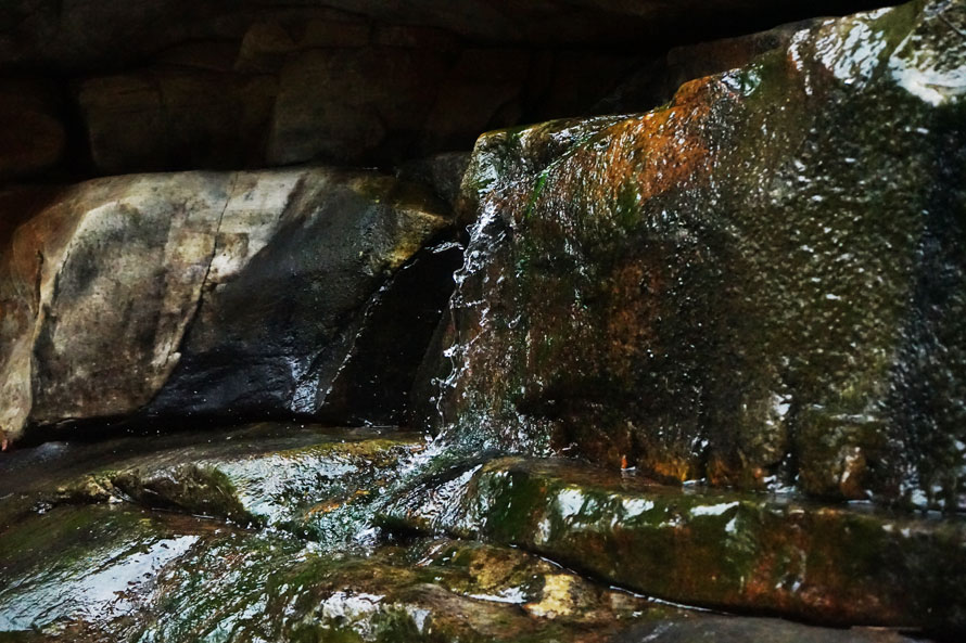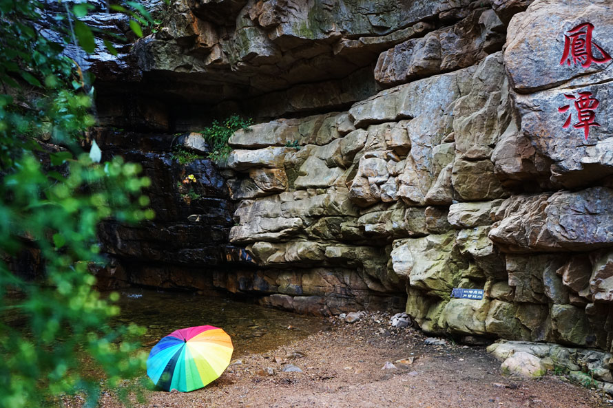 凤潭是峡谷里的又一景观,高山之巅的水流垂直而下,落入崖底,形成一汪碧潭,悬崖峭壁,谷深静幽,潭水不深,但却凉如化雪。近身观望,凤潭的崖璧裸岩层层错落,看一眼就觉得时光遥远。