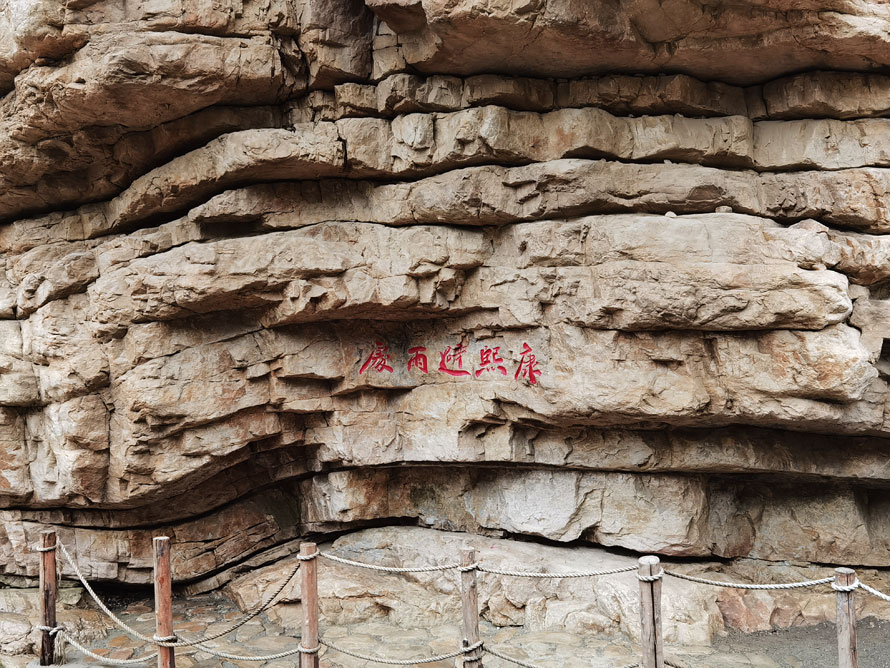 沿道路前行便是出口,如果你留意两侧山峰,还会发现一些自然形成的奇石,比如像一只鹰飞的“天鹰石”,还有一处像极了扑克牌K的人物石,它们在峭壁上浑然天成,矗立了亿万年,而在一面崖底的凹型处,还书写有一行字“康熙避雨处”,据说当年康熙帝出访巡游至此,天将大雨,他就在这里躲雨。如今置身之下,果然,头顶上方突出的岩石可以遮风挡雨,路过的人几乎都要在这里站一下,观察一番。