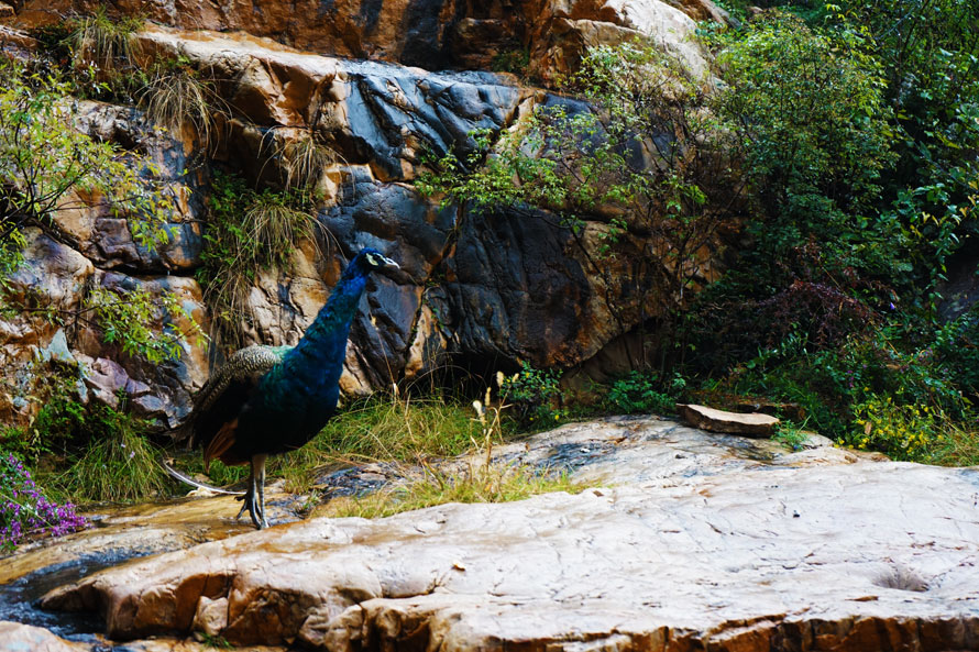 在大峡谷的出口处,还有一处值得观赏的风景,那就是孔雀放飞,景区会在每天定时在这里进行孔雀放飞,供游客免费观赏,孔雀的巢在一侧山崖,当被放飞时候,它们会展翅越过游客上方,飞向另一侧山崖,每当此刻,所有在场的人都会拿着手机拍摄,这样的景观实在难得一见。不过,只要你愿意,还可以喂食它们,在孔雀悠闲散步的时候。