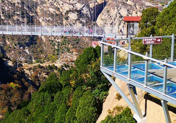 虽然夏季漂流已停止,但是可玩的项目还是非常多,悬空的玻璃栈道,这时候的玻璃栈道四面都是五颜六色的彩叶,漫山遍野非常的美,站在桥上欣赏着脚下的美景,红黄相间极为美丽。如果不是周末,人不会特别的多,可以尽情的在这里拍照,很多人来到这里就想拍一张不一样的照片,那么,现在来最好。