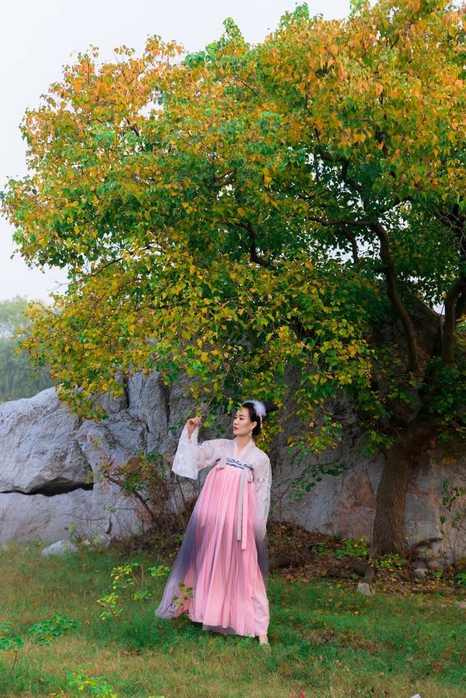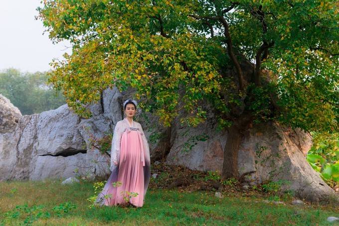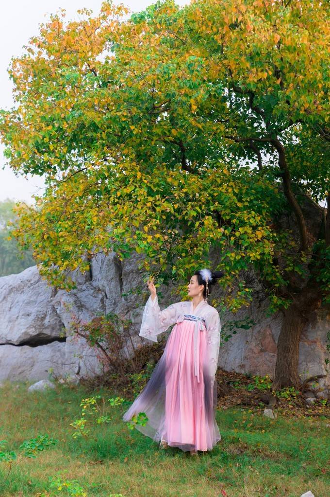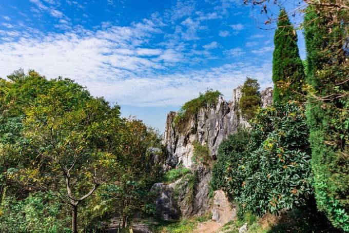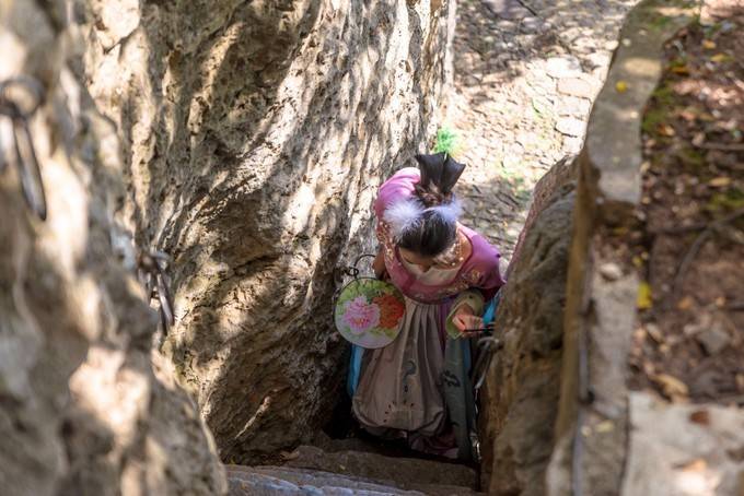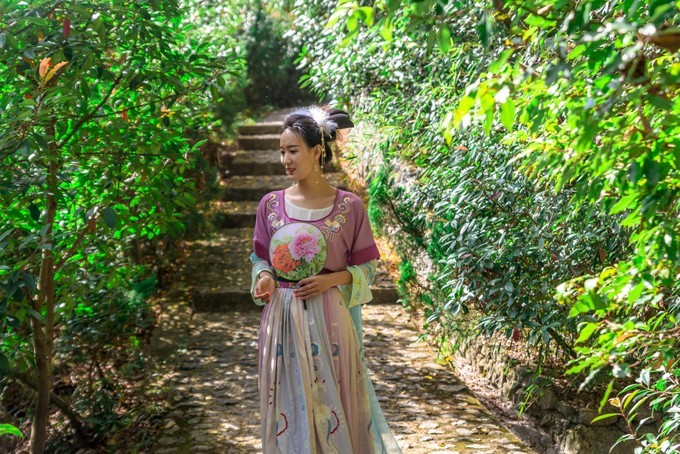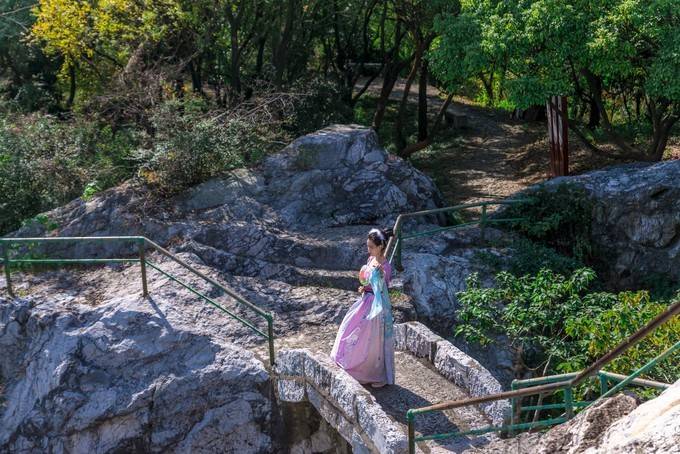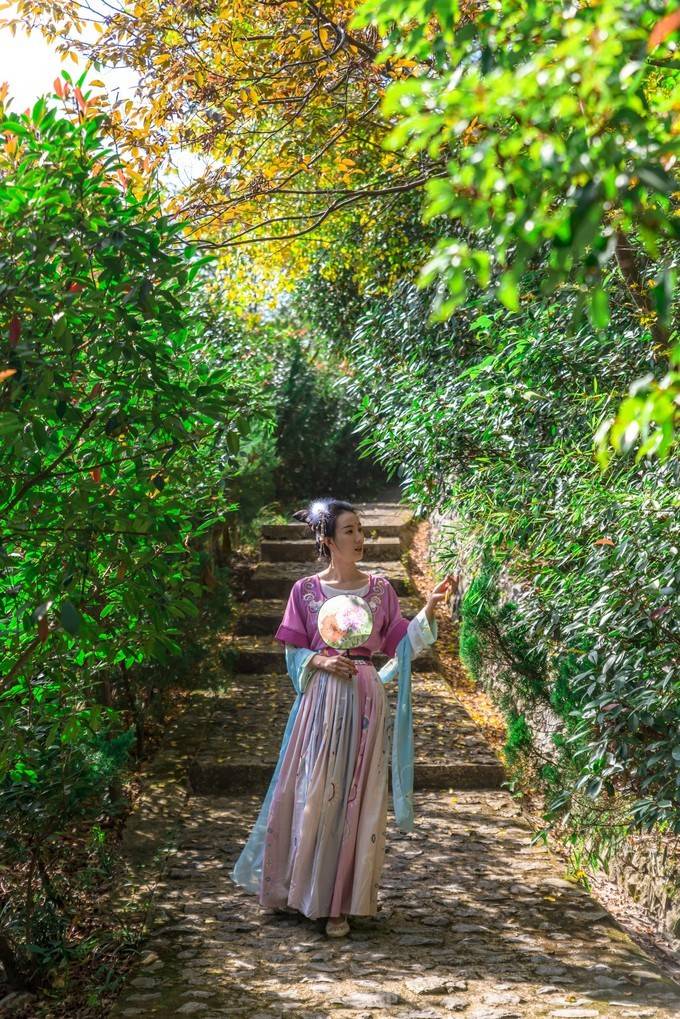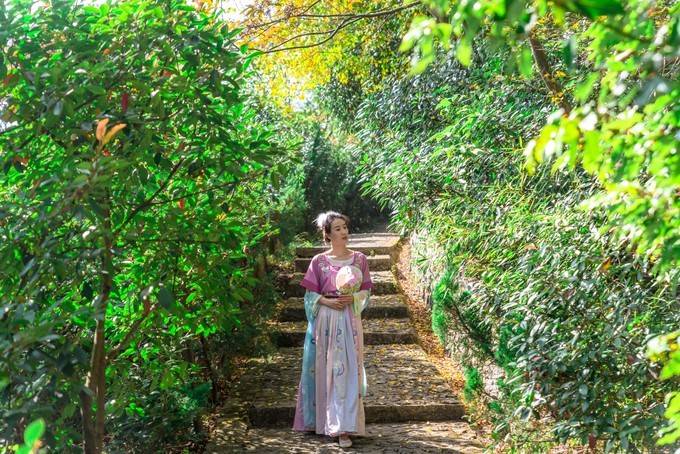 行山有不少的奇石怪坡,上山植被茂密,郁郁葱葱,穿着古装走在石阶上,轻摇团扇,疯扶轻纱,就像仙境里走出来一样。
