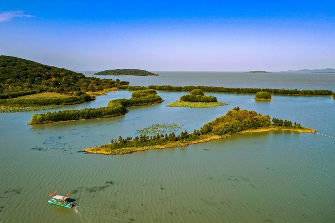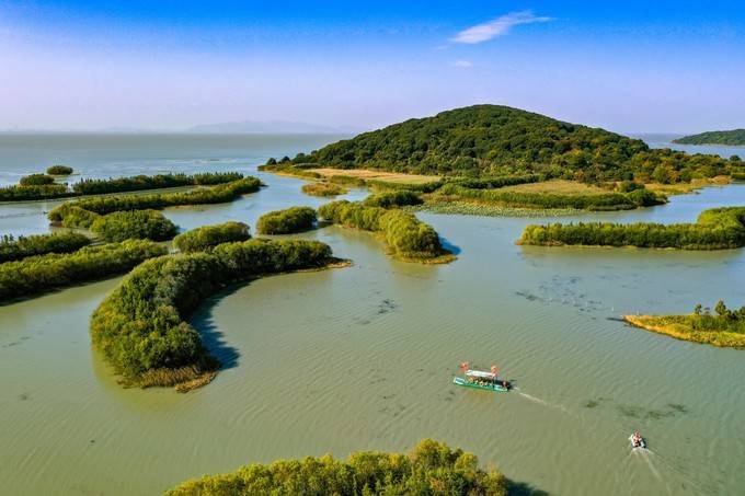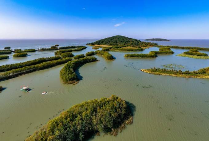一路望去,大山、行山、小姑山郁郁苍苍,三峰相连相依。山色作伴,三万六千顷湖光,悠悠环岛路串起点点珠玑。