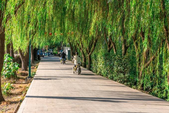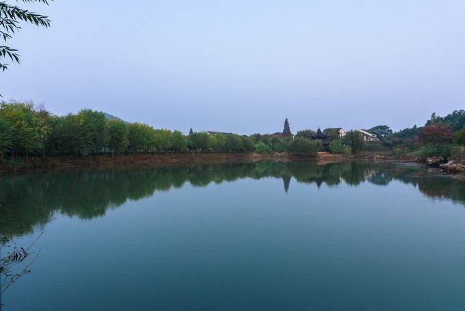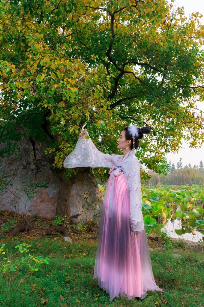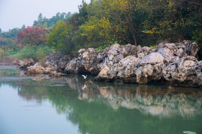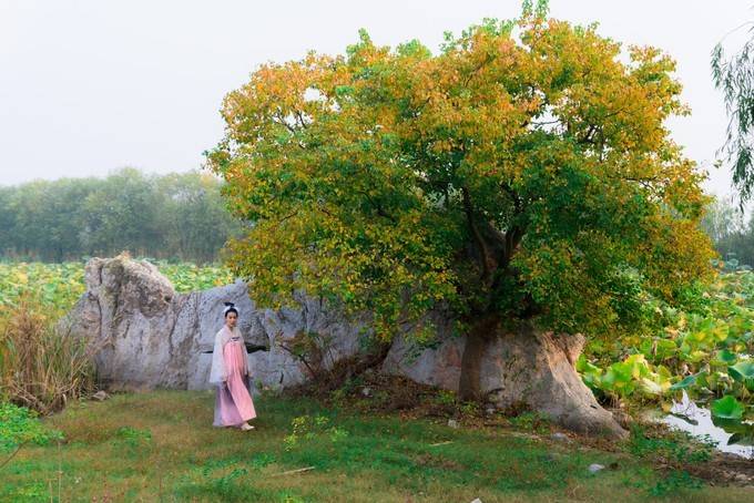 牛背石旁边正好有一颗茂盛的 大树 ,在这里拍照还是挺出片的。秋天,树上的叶子由绿转黄,荷塘里的荷花只剩浮萍点点,时光的印记在这里尤为明显,有一种独特的国风美。