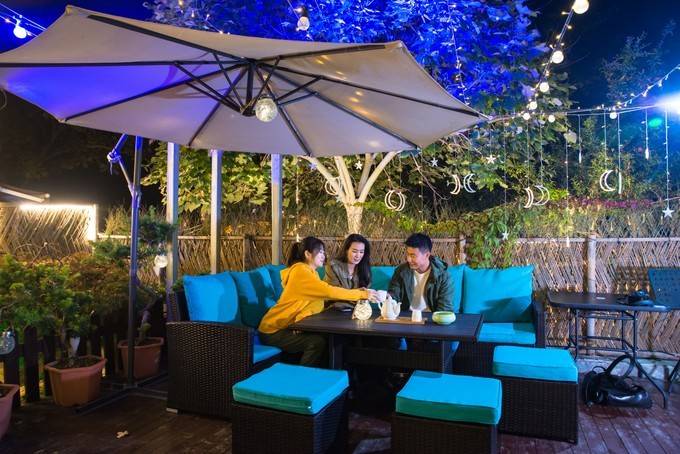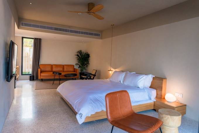 岛隐坐落在牛背石附近,周围比较的安静,房间和公共区域都是比较温和的暖色调,院子里有一个小酒吧,晚上三五好友小酌一杯,舒适安逸。
