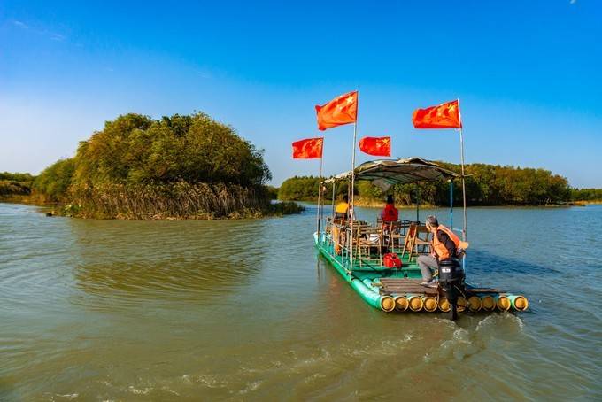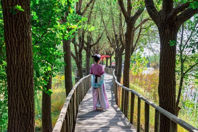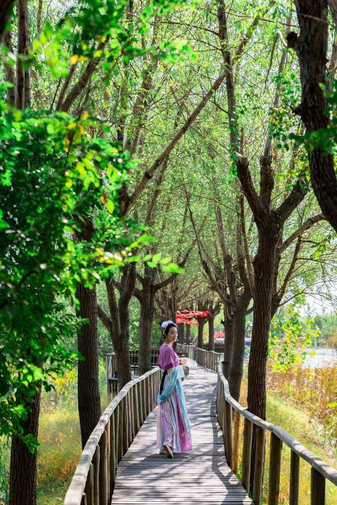 走过 长寿 桥便是三山岛湿地公园的入口,一条长长的木质栈道伸向远方,两边绿树成荫,阳光透过枝叶铺撒在栈道上,光影婆娑。