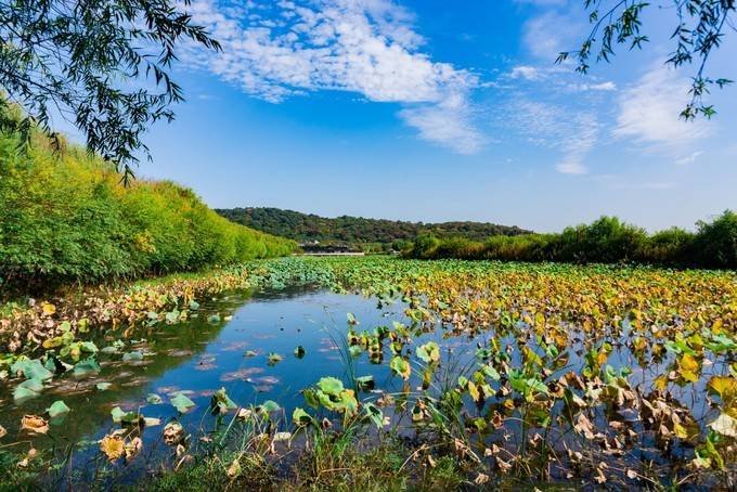 秋天已经不是荷花盛开的季节,一望无际的荷塘仅剩下根茎叶还在独自坚强,蓝天白云下,湖水更加的清澈透亮,这个时候都有一种广阔大气的秀美,脑海里不由自主的想象,当所有荷花盛开的时候,又是一副多么美妙的旖旎画卷。