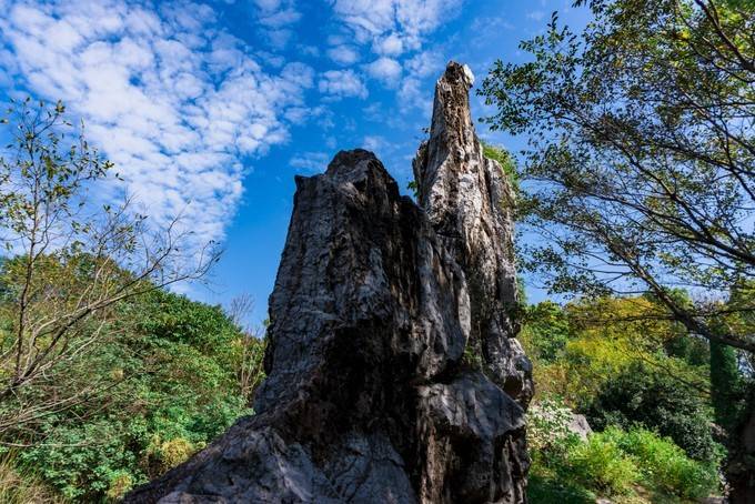 行 山西 坡的板壁峰,是一块宽约20米、高约10余米的峭岩奇石。岩石陡峭如斧劈,纹理纵横如刀刻,青苔斑驳,藤蔓攀附。小树花草生于石缝之间,山雀野鹰舞于峭壁之上,景致美妙怡人。三山的石质都是青石,暴露在地表的石头几乎都有 太湖 石瘦、漏、透、皱的特征。