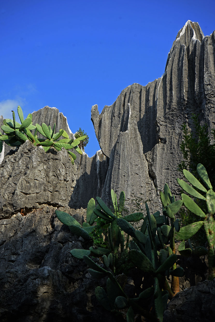 继续游走,登高望远,石峰石柱有的甚至状人拟物,惟妙惟肖,有的好似撒尼族人传说中的美丽少女阿诗玛,头戴包头,身负背篓,亭亭玉立、翘首远望,有的如同“象踞石台”,像一-头凝固的大象立于石峰之上,有的像“干钧一发”,一块嶙峋巨石被两根壁立石柱撑在半空,看似随时要下落,经过其下,无不胆战心惊。石林奇石,无不形神兼备,栩栩如生,令人产生无尽的遐思。