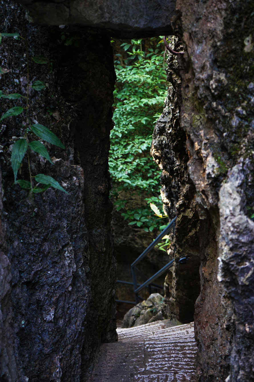 随意游走在羊肠小道的峡谷,头顶一会是一线天,一会宛如洞口,小径一会宽阔,一会侧身才可通过,满目岩石,宛如进入石峰石柱的海洋,举目四望,美妙造型比比皆是。穿行在石缝间的曲折蜿蜒的小径,忽而可达峰顶望远,忽而可至深谷探幽,嶙峋的奇峰怪石与奇花异草相映成趣,既有雄奇阳刚之美,又有阴柔妩媚之幽。
