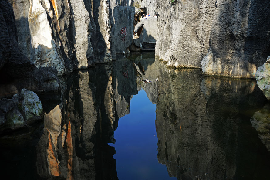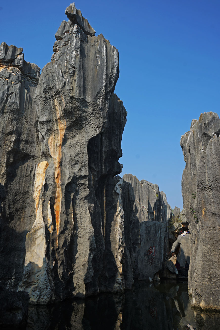 遇见一潭清冽池水,山峰倒影,映照蓝天,颇有尖削石怪刺蒼穹、虚谷自生风的江湖质感。距离水面较近的一处山石上刻着“剑峰池”三个字,据说这片池水是这里内罕见的天然水泊,同时也是这一地区的最低海拔点(海拔1739.3米),也正是由于这一原因,剑锋池成为大小石林地下暗河的露头处和地下水的聚合点。这里最大水深9米,平均水深6.4米。曲径通幽,石峰高耸,水石相映,仪态万千,使剑峰池成为大石林中极其独特而优美的景点之一。