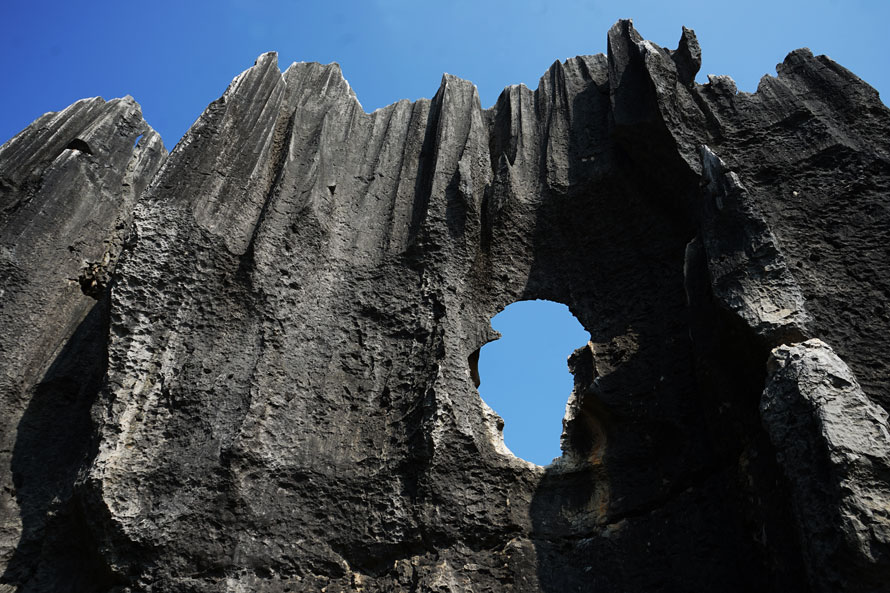 到处都是如墨的黑色岩石,摸一下手指并未染黑,这就是黑松岩,是云南石林一处奇特的存在,石质黝黑古朴,气势磅礴,有如大海怒涛冲天而起,或在角落暗自静谧。