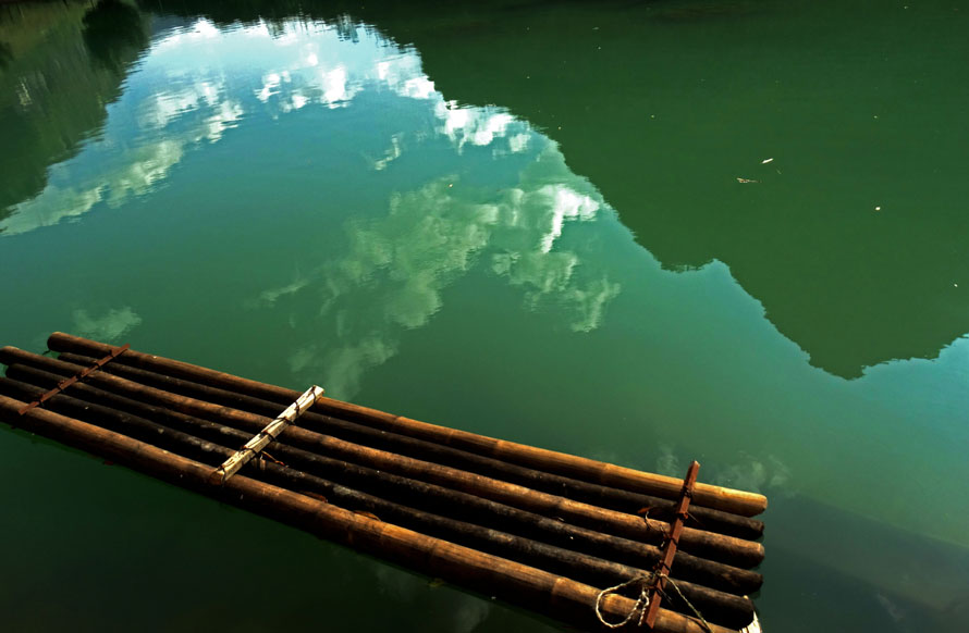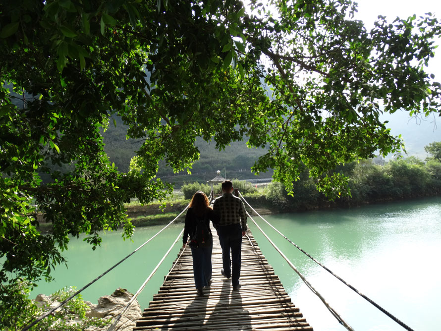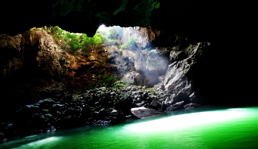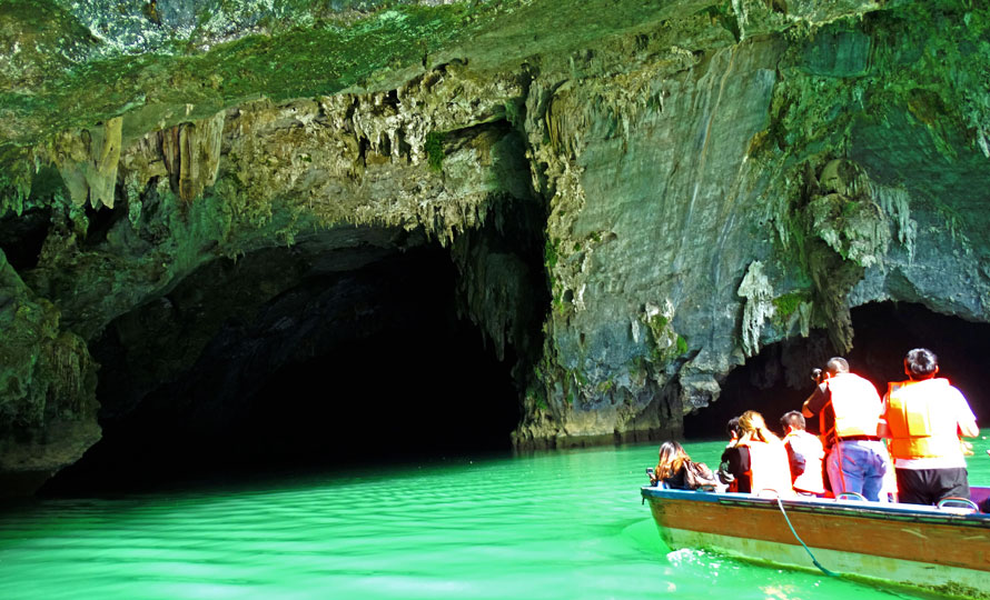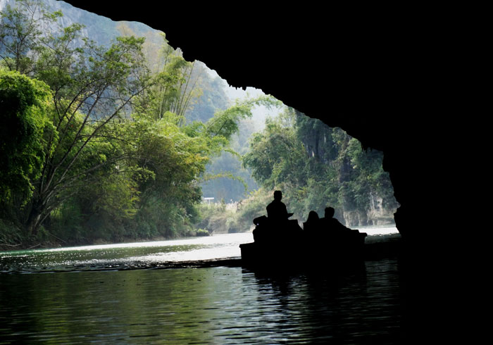 行过一簇又一簇碧绿碧绿的凤尾竹,行过一丘又一丘阡陌纵横的稻田,行过一座又一座起起伏伏的青山,行过一条又一条波光潋滟的河流,在山水相逢的地方,巴马百魔洞到了。