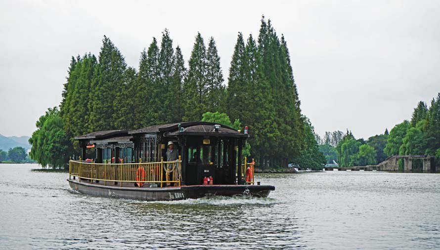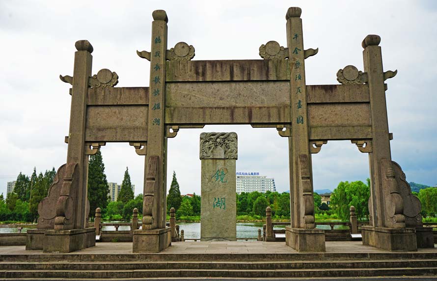 岸边有一块牌匾介绍,鉴湖面积为1.47平方公里,形成于1800多年前。水面和四周小径建有亭台楼阁,烟波浩渺里,小舟与建筑和岸边房屋勾勒出无与伦比的美感,这里氤氲的每一缕气息仿佛都暗含历史的诉说。