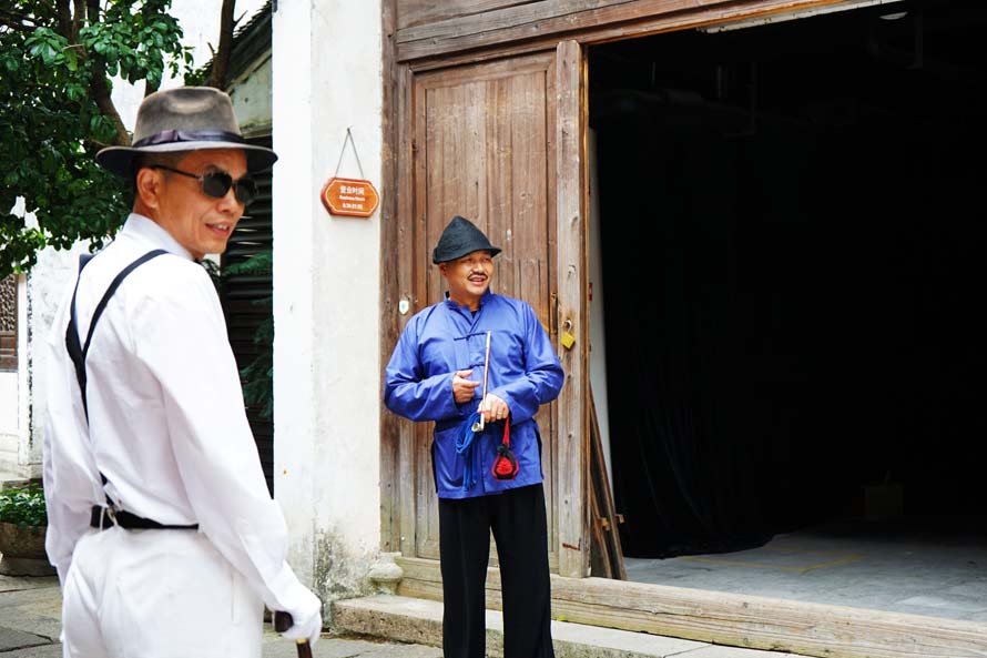 一进鲁镇大门就是粉墙黛瓦、小桥流水,沿河的民居、商铺错落有致,走在石板路上,看到衣着清代服饰的巡街兵丁,还有旧时人们的装扮,祥林嫂、假洋鬼子、鲁四老爷……鲁迅笔下的人物,一个个出现在街上,你仿佛到了另一个朝代。那些扮演古人的男女表情自然,好像穿越而来,间或各自打个招呼,还有看着好像是街痞的人,叼着旱烟,不怀好意地看着你……当然这是在展现遥远的生活场景。