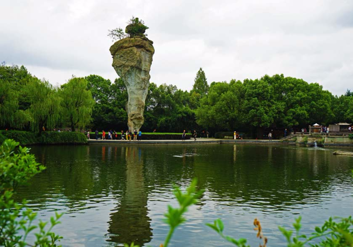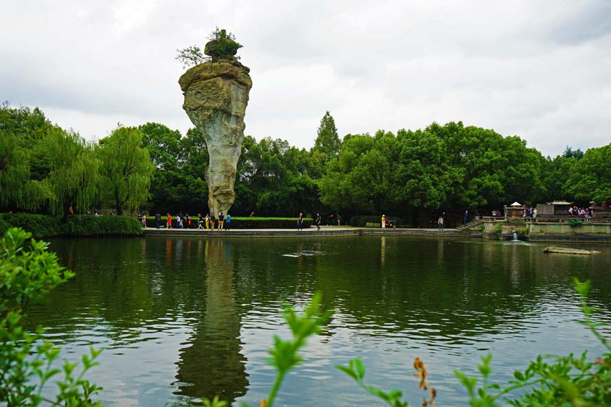 这就是传说中的柯岩奇石“云骨”,它的形成完全源于人工刻凿,上大下小的奇异石柱突兀地矗立湖边,直耸入云,从侧面观赏,云骨底部宽不足一米,而上方却有数米宽,可谓天下奇观。