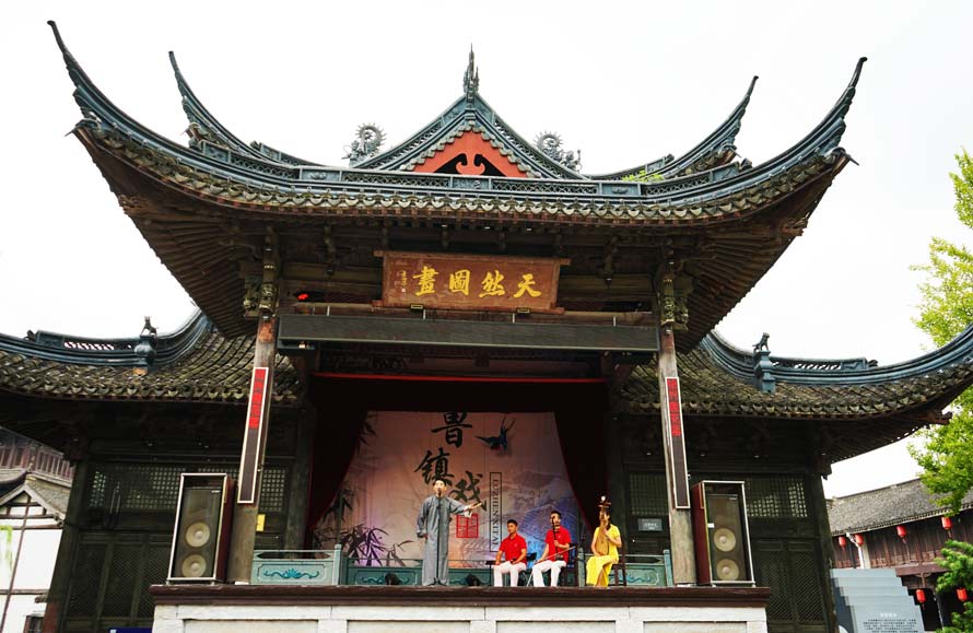 鲁迅在作品里无数次描写的小时候的戏台,毫无意外,这里也有一座戏台,不过不知道是否还唱着当年的小曲,我到的时候,这里正进行这表演,一个穿着大褂的男子在咿咿呀呀的胡琴声中吟哦唱和,是鲁迅的社戏吗?我不知道。如今这个戏台,会时常表演一些文艺节目,给游客们带来江南的欢愉。