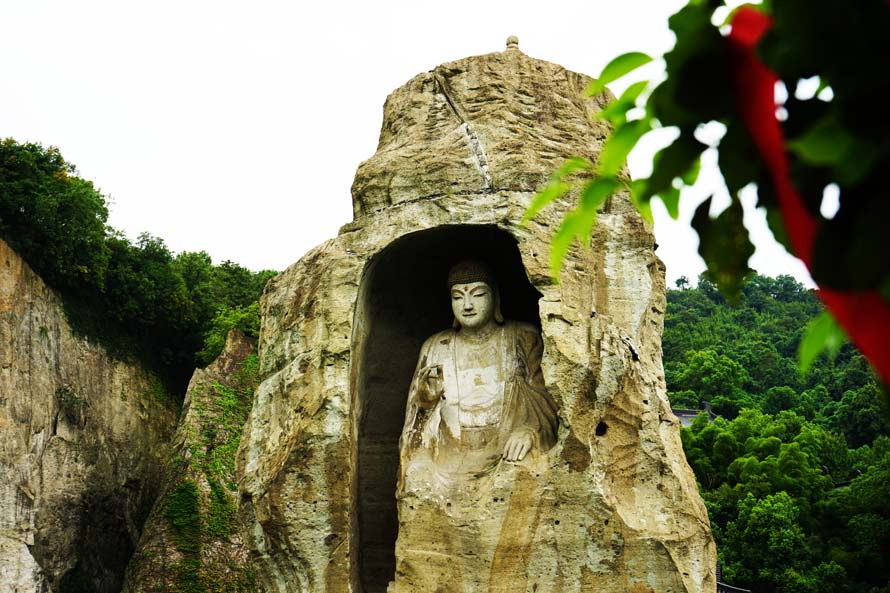 沿着弯弯曲曲的河道前行,你会看到一些奇怪的山峰,说是山峰似乎不准确,但却也没有什么词语来表达,那一根石柱般地石头直直地矗立在湖边,像假山,貌似有又不是,一块牌匾上说这是古代开山采石造就的景观,周围的石壁上还有一些佛像,不过这一根石柱看起来的确令人惊讶。