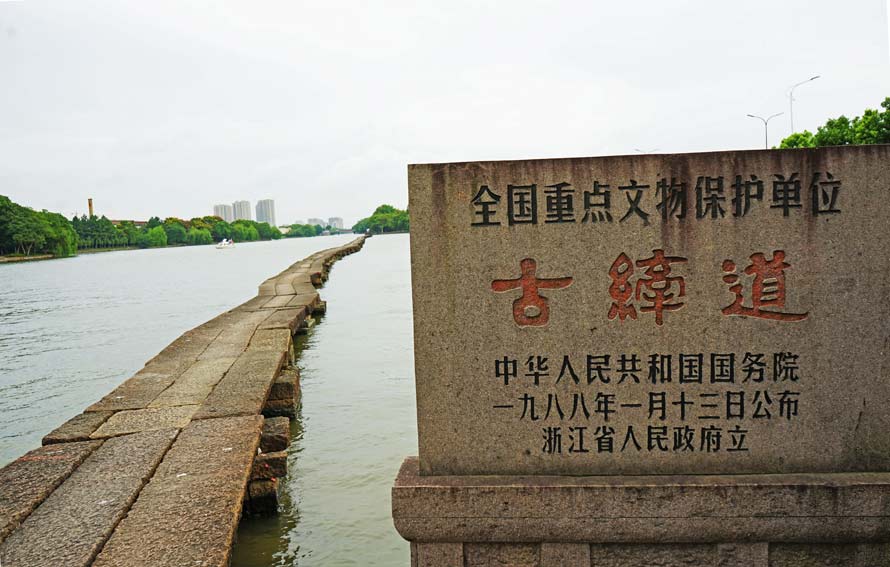这里还有一处值得一提的地方,那就是古纤道。出柯岩景区,沿着水岸走,在水中的那条石板铺就的小径就是,目测宽窄不过80厘米,仅容一人通过。据说这条小径就是旧时人们拉纤所走的路,不过后世有多次重修。在古时,这条小路也是人们避风躲浪的通道。