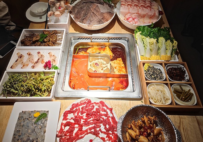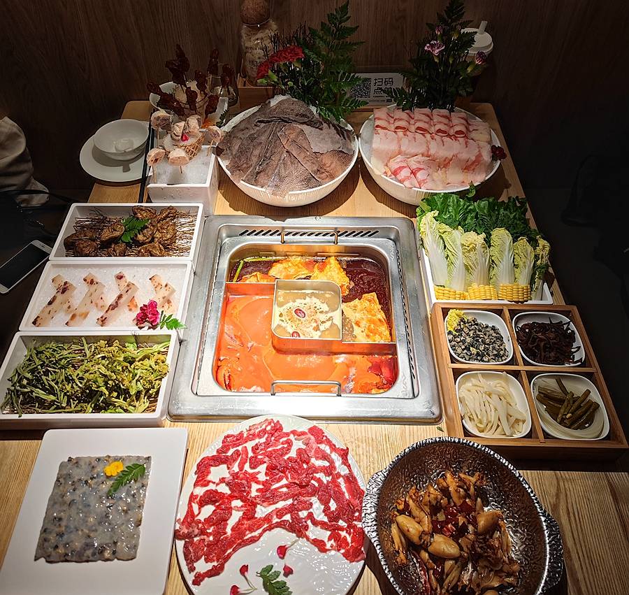 店里的锅是特色的三味锅,有三格,可以有三种汤底,我们选择了螺蛳粉汤底+番茄汤底+松茸菌汤底,一锅就可以品尝三种美味!