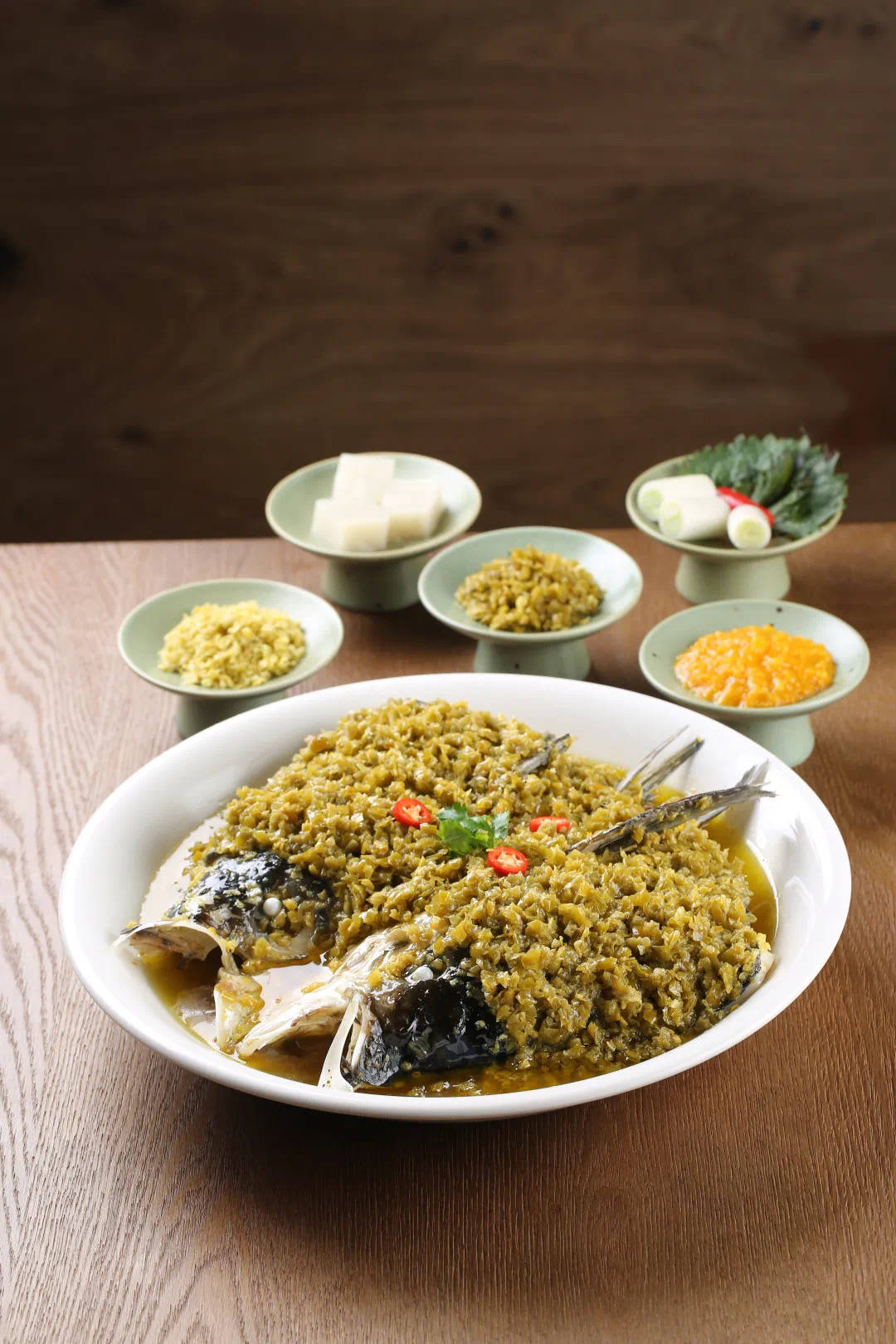 传位堂剁椒鱼头的特有酱椒,除了来自湖南的辣椒之外,更臻选云南、海南、山东共计四省的辣椒作为基础进行腌制,口感鲜辣脆爽;而秘制鱼糕则以新疆大羊骨、猪皮、陈皮、桂皮等十几种中草药熬制而成。在蒸煮鱼头的同时将特制椒酱与鱼糕平置其上,还需辅以少许紫苏叶去腥。在海鲜蒸柜蒸煮15分钟后,融入少许福建山茶油佐味提香,一道鲜湘碰撞、有别传统的剁椒鱼头才算完成。