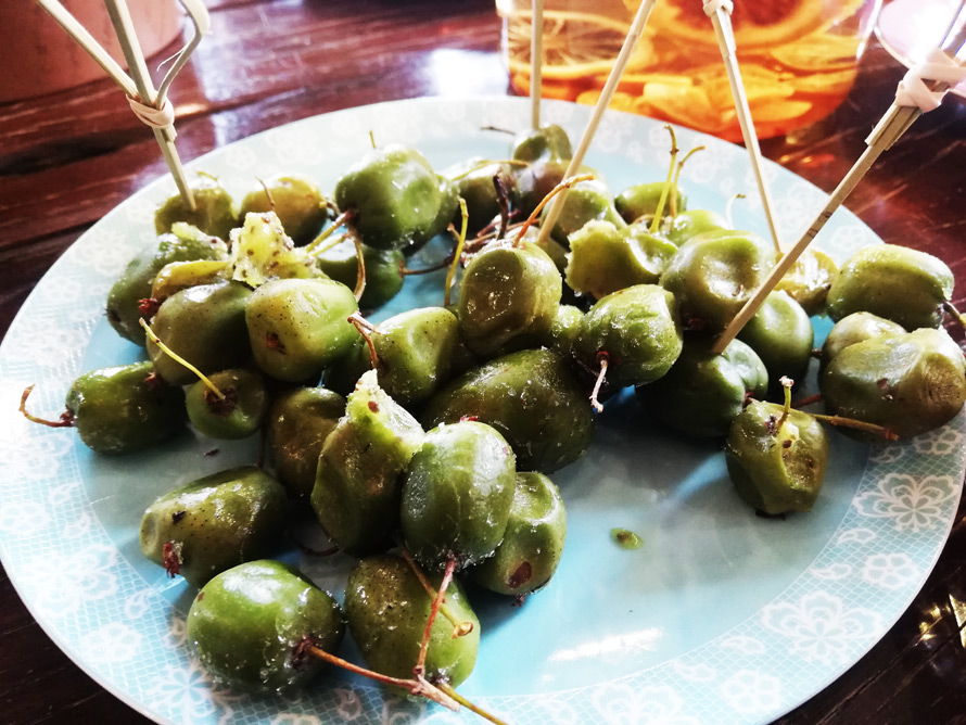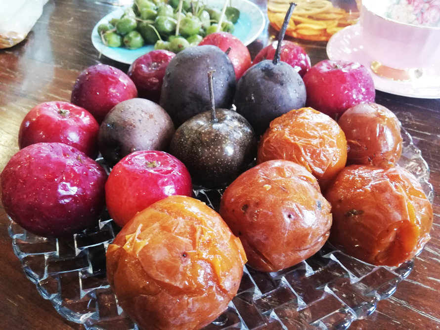 这里的冻水果有冻梨、冻黄桃、冻柿子、冻海棠果、冻苹果等等,初次见到这样的水果感觉很稀奇,等到咬一口柿子的时候,竟然担心那种凉会把我的牙齿冻掉,口感冰冰沙沙,凉甜无比,这是我之前不曾吃到的食物。