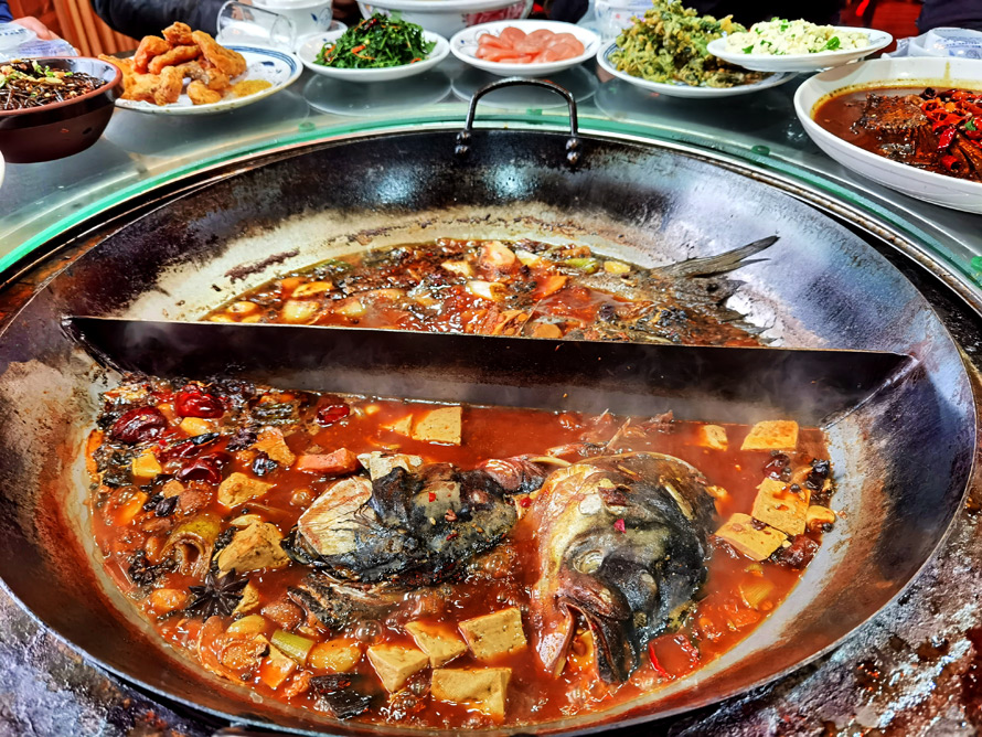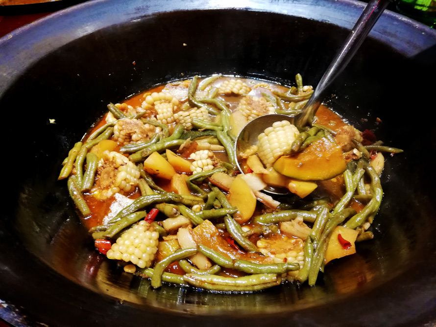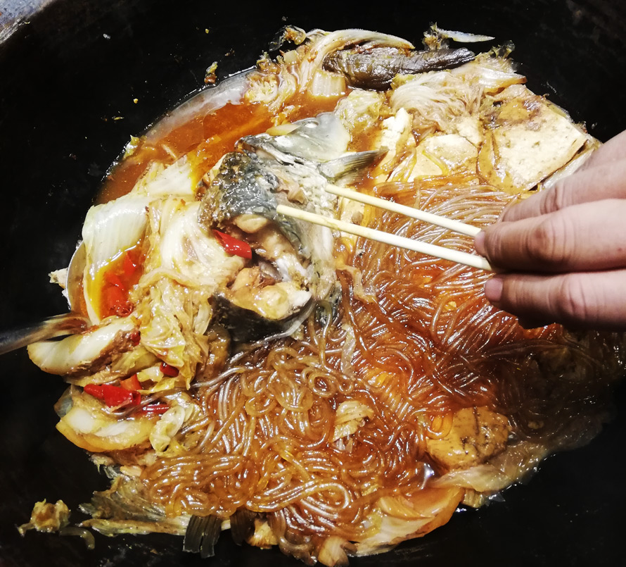 大火在灶台里噼啪作响,店家会将食客点的食物清洗干净,分时间段逐一端过来放进有清水的大锅中,鱼或者排骨、鸡以及各种蔬菜,同时还会在锅的一圈贴上饼子,当地人叫贴饼子,是那种玉米面做成的面饼,二三十分钟后,当锅里的鱼和排骨熟透,贴饼子也就可以吃了,这时候,大家开动筷子,很快就能将一大锅食物扫荡一空,锅上的玉米面贴饼子沾浓浓的汤汁,那叫一个香……