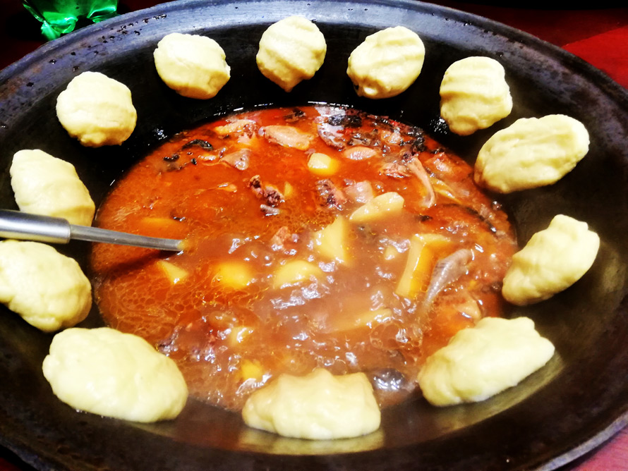 与冻水果截然不同的,是这片大地上另一种吃食——铁锅炖,“铁锅炖一切”是这种吃食的精髓,一群人围着一方锅台,中间是一口大黑锅,里面炖的食物各种各样,各种肉类、白菜、酸菜、粉条、豆角等,能想到的能吃的所有食物都可以一锅炖。