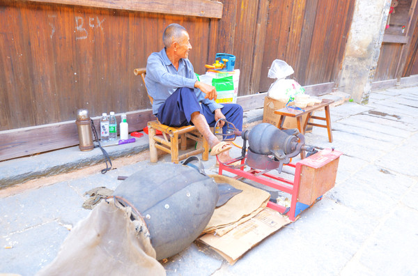 当年古街上的一些店今天还开着,不过有的是店主换了,有的是货架上的商品换了,富龙我看到了梁必愈艺术工作室,看到了红木精品馆,也看到了几家小食品商店,进店的顾客很少,喧哗也少,街上显得有些冷清。
