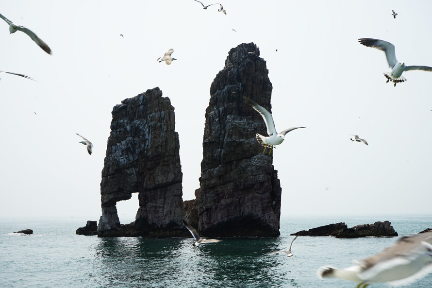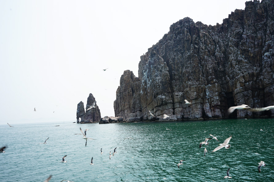 从岛上的小村码头出发,客船行进大约二十几分钟的样子便可抵达庙岛,海鸥似乎是这里的主人,不知道从哪里飞出来,成群结队,追着客船,有人抛出面包屑或者将火腿肠切成小块,它们俯冲着过来抢食,然后有飞快离去。沿途有一些小岛仿佛荒芜,或者准确说是一座孤立的小山,没有草木,也没有建筑,宛如巨大高耸的礁石,但却称得上是小岛或者小山,或许那就是海鸥的栖息之地吧。