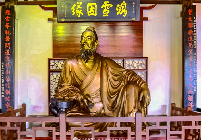 走出载酒亭,拾级而上就是载酒堂。正殿悬挂"载酒堂"的匾额,是乾隆年间书法家、当地举人张绩的墨宝。大殿正中是东坡先生讲学的彩雕:东坡持卷讲授,好友黎子云在认真聆听,儿子苏过恭敬地站在一旁,塑像工艺稍显粗略,但可见当时“载酒堂”内东坡父子与当地士人把盏酬唱、相濡以沫的深挚情谊。
