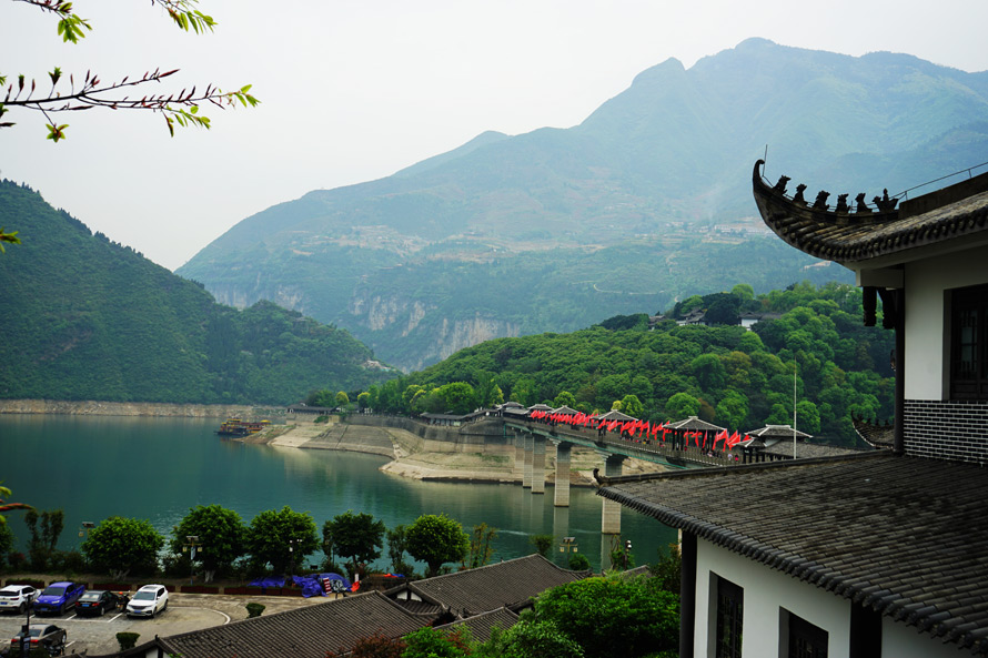 “若言风景异,三峡此为魁”。在廊桥之上眺望三峡之首的瞿塘峡,赤甲、白盐两山,以其斧劈刀削、高耸入云之势,构成闻名天下的险关——夔(kui)门,成为奉节县独有的大美奇观。“白帝高为三峡镇,瞿塘险过百牢关”,瞿塘峡的险在古代似乎无可匹敌。