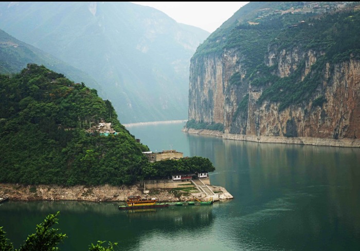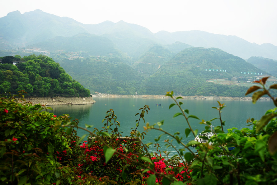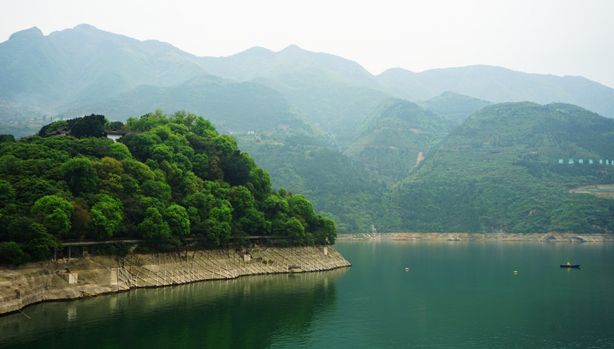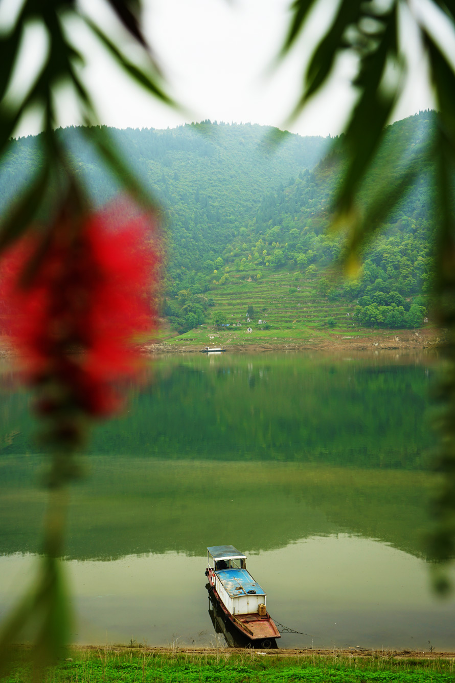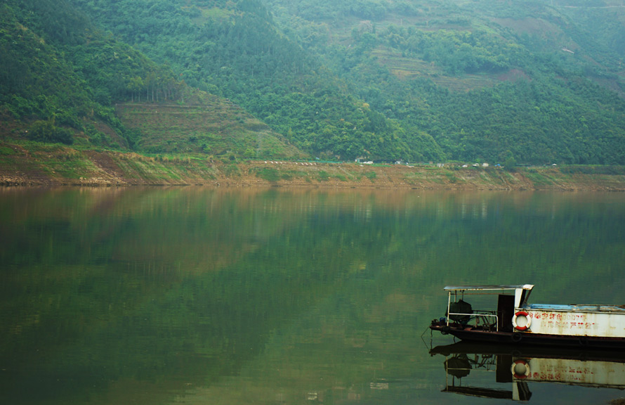 我到这里的时候是一个春季的末尾,江水浩渺,静缓流深,山川绿意正浓,有船只在江中穿梭来往,江面有水汽升腾,雾霭山岚将视野的远处描绘成朦胧的水墨,那种国画般的质感浑然天成。