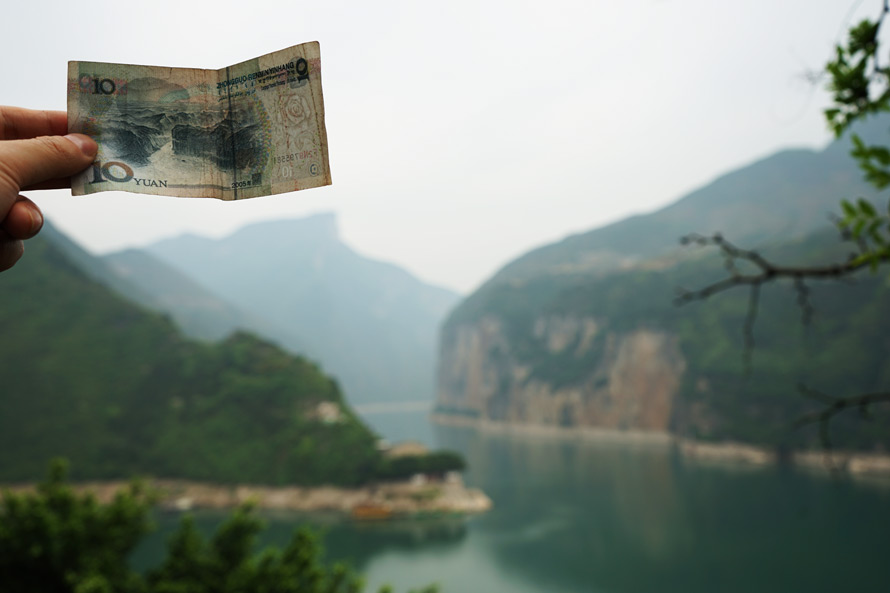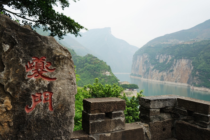 站在岸边的观景台,夔门瞿塘峡口一览无余,赤甲、白盐两山隔江对峙,把整个江面锁的很窄,像一扇门,因奉节古称夔州,所以将这道锁江大门称为夔门。观景台左侧立有石碑,上刻“夔门”二字,夔门不仅是三峡的标志,10元人民币背面的图案,也是重庆的重要地理标志之一。