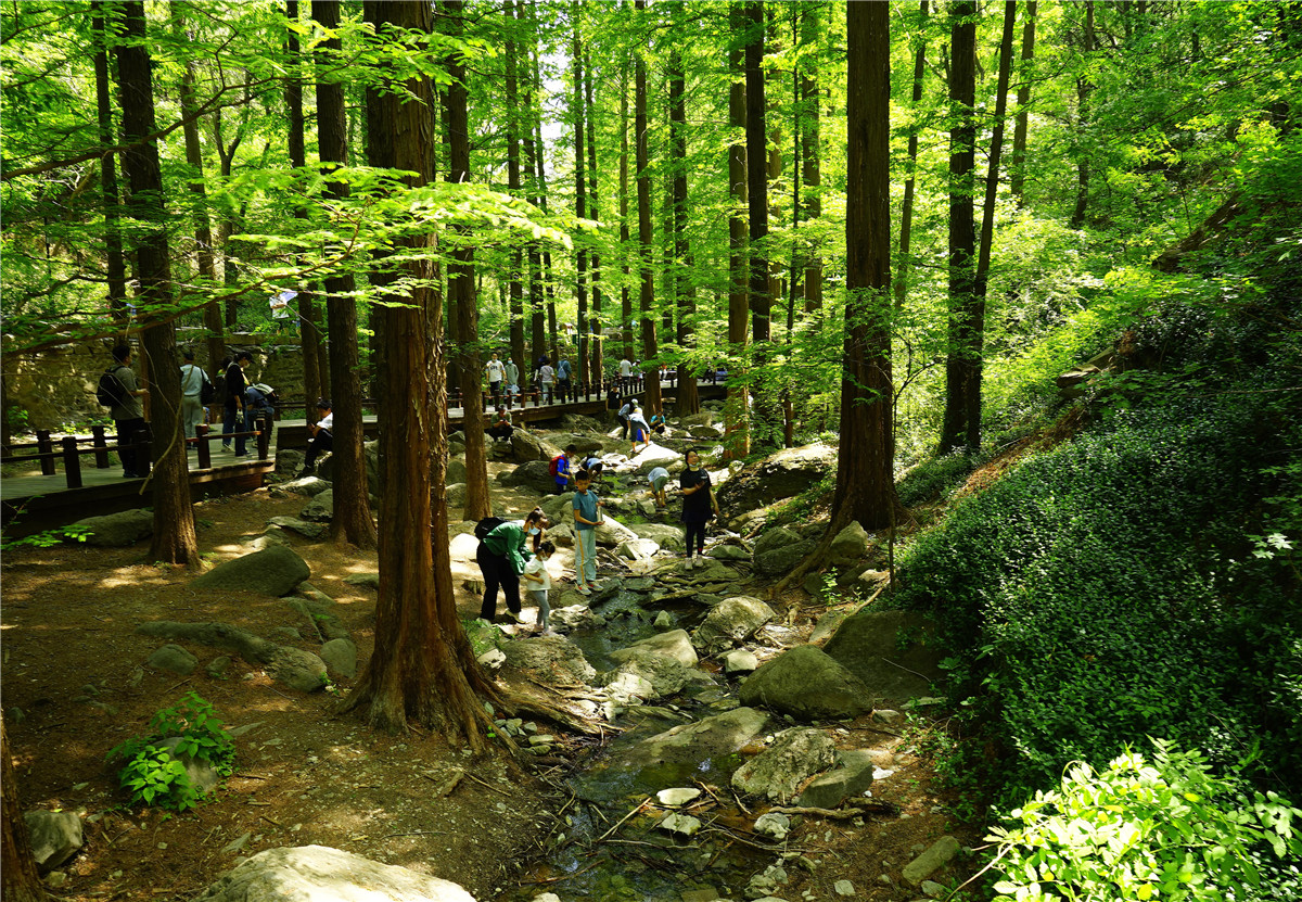 走进刚刚揭牌的“国家植物园”,山水间优美的风光让游人流连忘返,而我则更加急切地行走在通往樱桃沟的山路上。很多年没有光顾这里,山花烂漫,溪水潺潺,野趣横生依旧。特别是走进被誉为“活化石”的水杉林,山林间投洒的光影,溪水旁嬉水的娃儿,让人恍如置身于世外桃源。