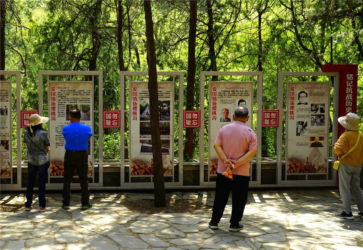 顺着山间木栈道一路前行,樱桃沟沿途“勿忘国耻 圆梦中华——北京市爱国主义教育基地一二·九运动纪念地”的路标指引着游人走进山谷深处。山间一块平坦之地,上世纪80年代中建设的“一二·九运动纪念亭”吸引人们的目光。
