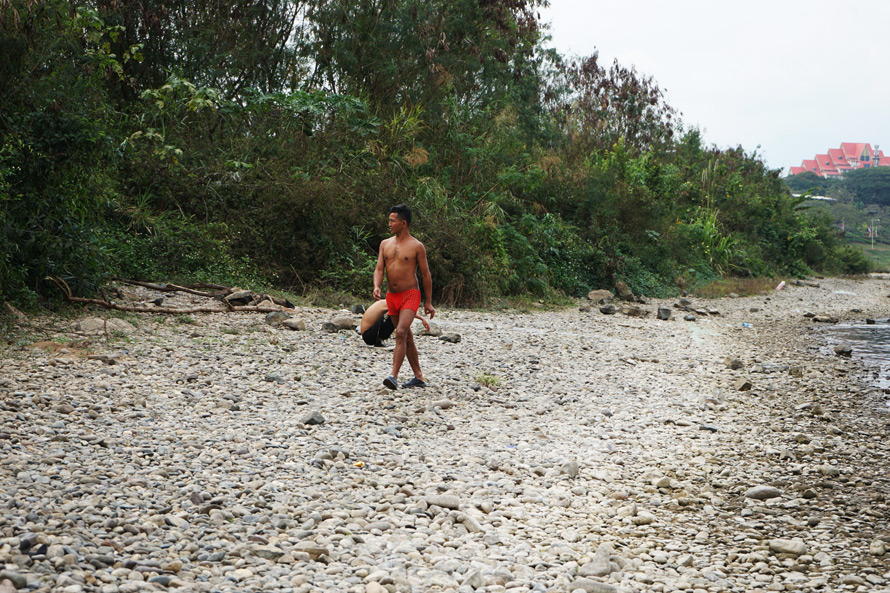沿着一条小径,穿过一片沼泽和荆棘丛,便到了江边,江水清澈,静缓而流,西双版纳的阳光火热地照耀着流水草木,一种与世隔绝的静谧瞬间就扑面而来将我包围,欢喜、惬意油然而生。