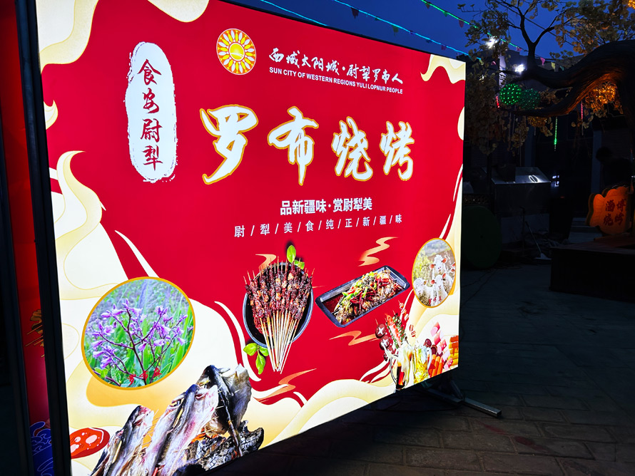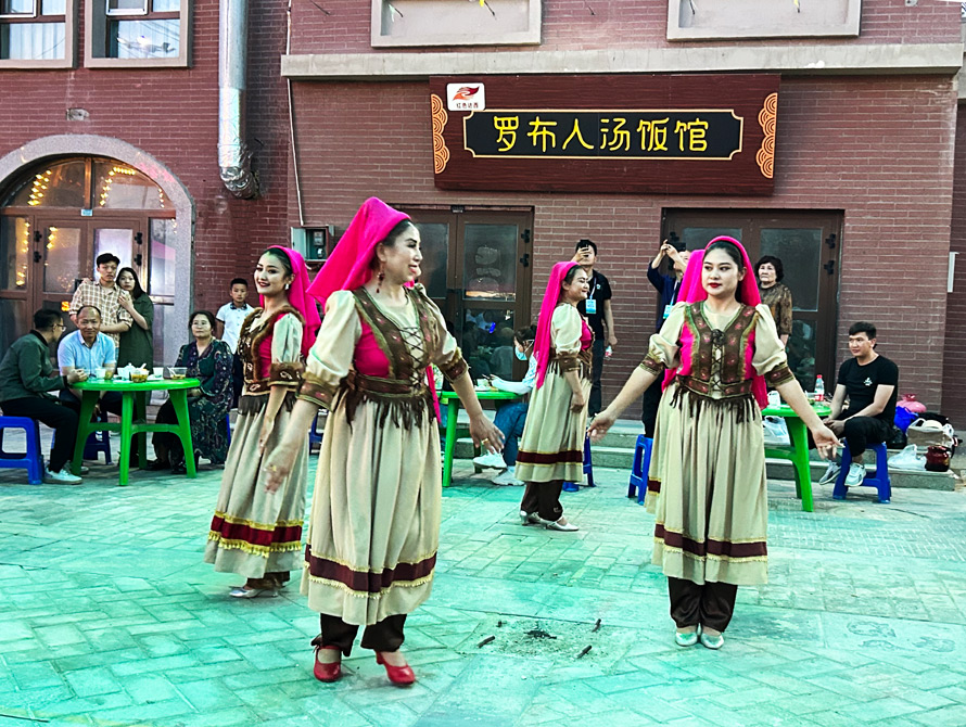 傍晚时分,位于达西村风情街的饭店店员身着传统服饰跳起“做饭舞”,该舞蹈取材于尉犁县民间传统生活方式,表现了罗布人浓郁的生活气息。如今,“做饭舞”和罗布淖尔(罗布泊)民歌、罗布淖尔狮子舞等一样,都成为当地的非物质文化遗产并被收入各级非遗项目名录。
