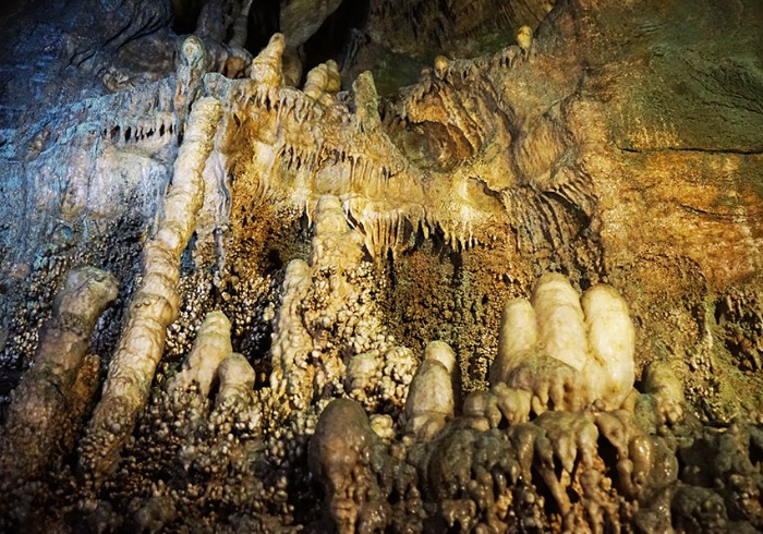 洞内的光线时明时暗,各种颜色的灯光打在钟乳石上,呈现出各种色彩,宛如神话片里的深海龙宫,各种式样的钟乳石有的生在洞壁上方,有的生长在洞壁角落,有的色白如雪、质纯似玉,有的微黄如蜡烛,有的形状像塔、像柱、像手掌,还有的像瀑布以及堆起来的土豆等等。