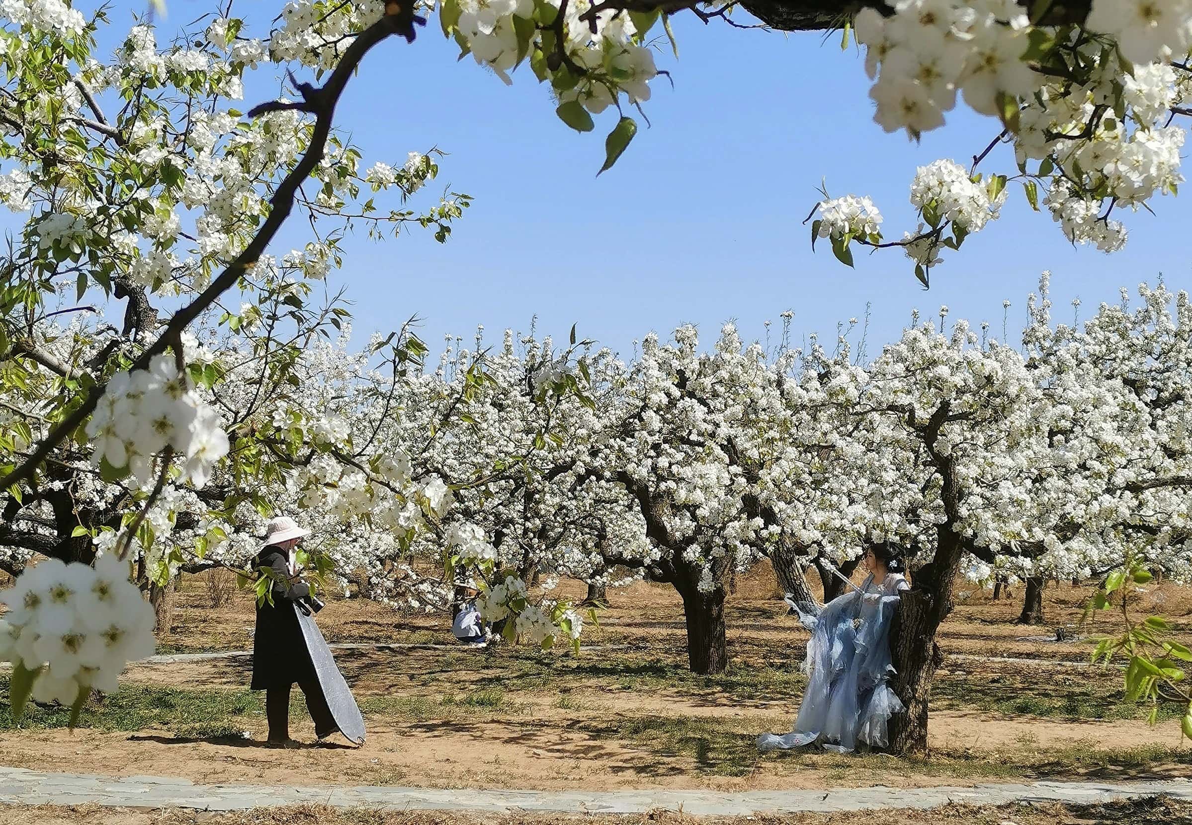 梨园还是天然的摄影基地,身着古装的模特们漫步梨树下,衣袂翩跹与雪白梨花相映成趣,每一张照片都自带古风韵味,定格下专属春日的美好。
