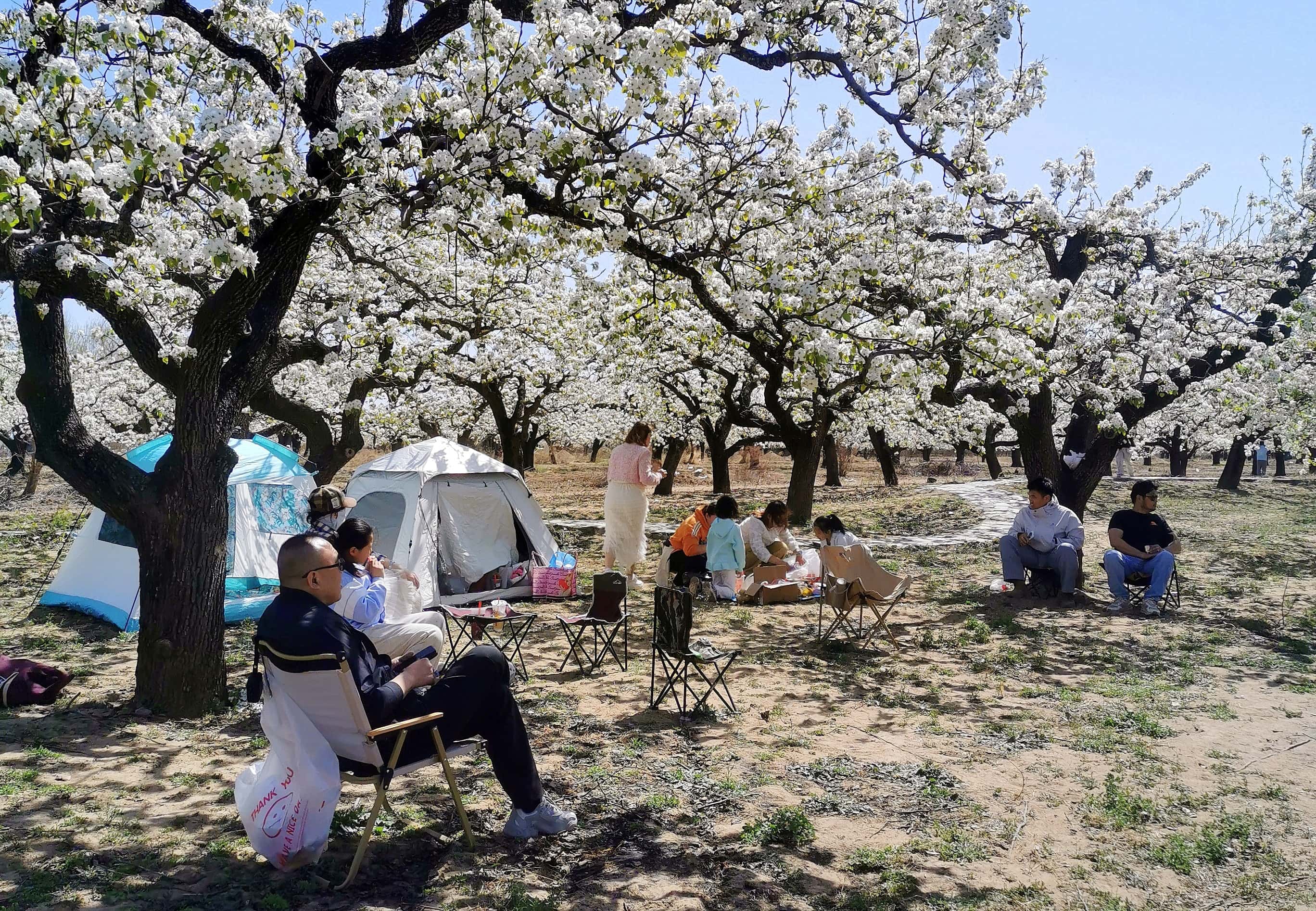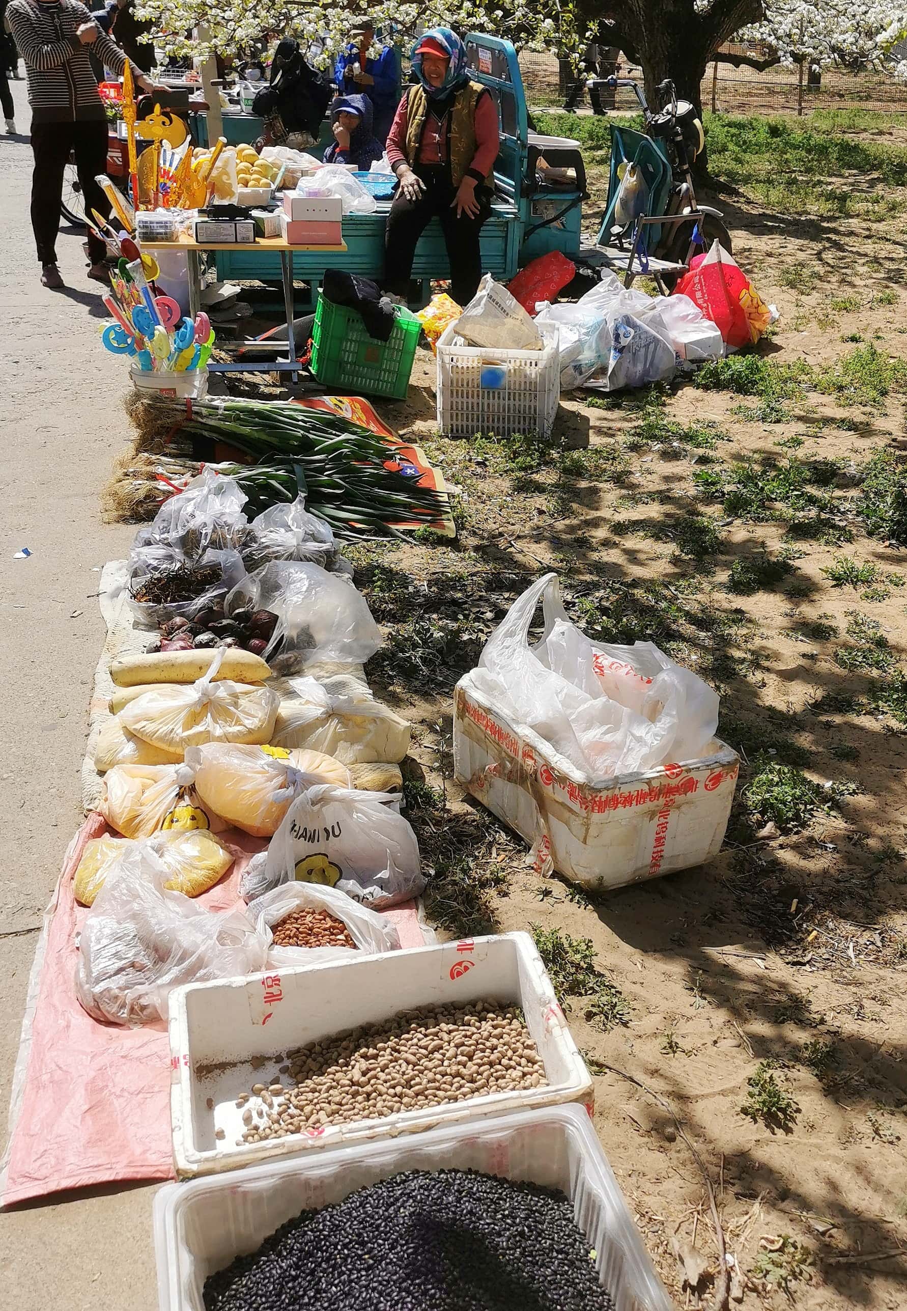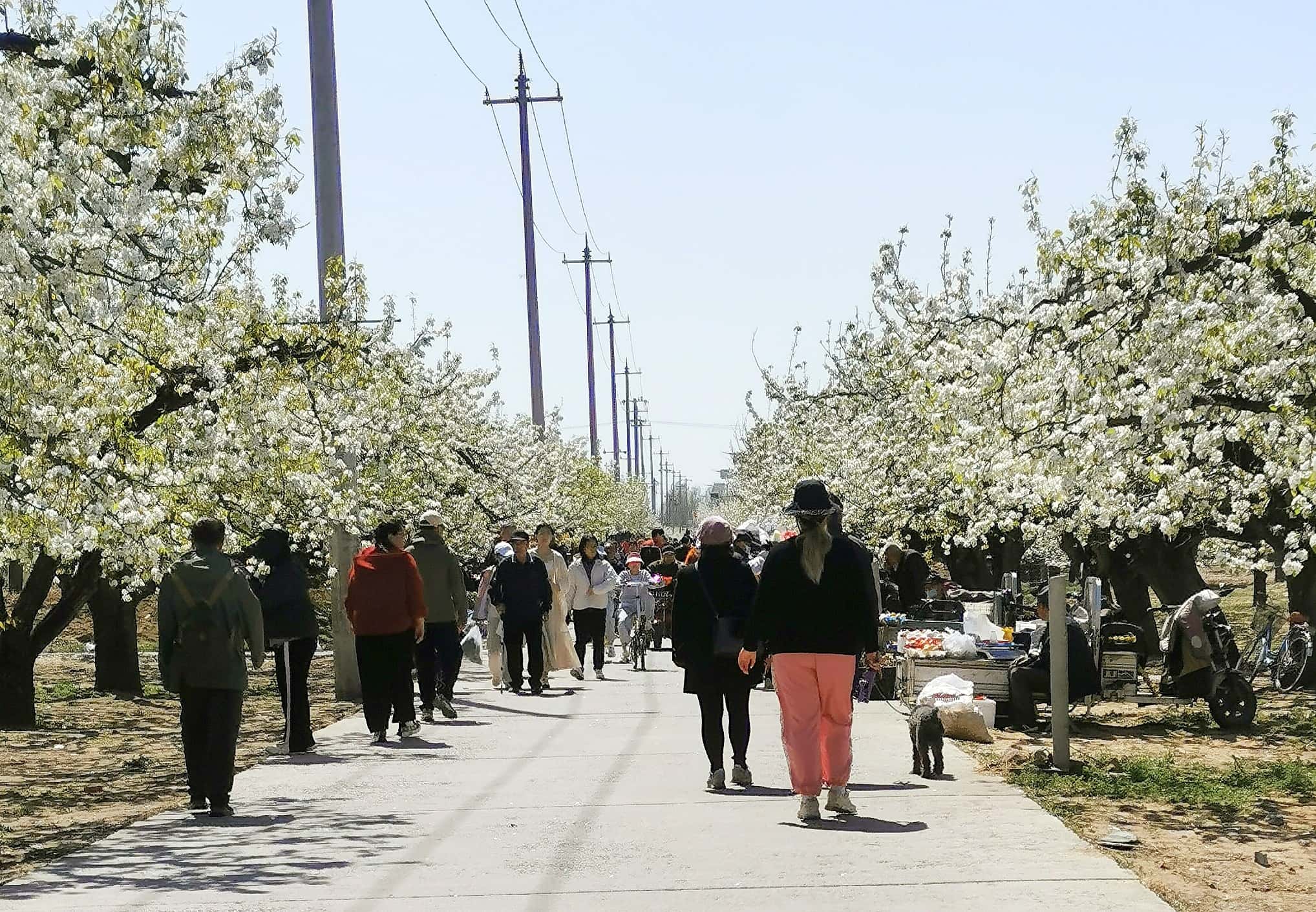 梨园深处,村里的百姓摆起小摊,鲜嫩的小葱、白菜,还有特色京白梨等土特产,吸引着游人驻足选购,赏花之余带一份原生态的美味,为踏青之旅增添几分烟火气。