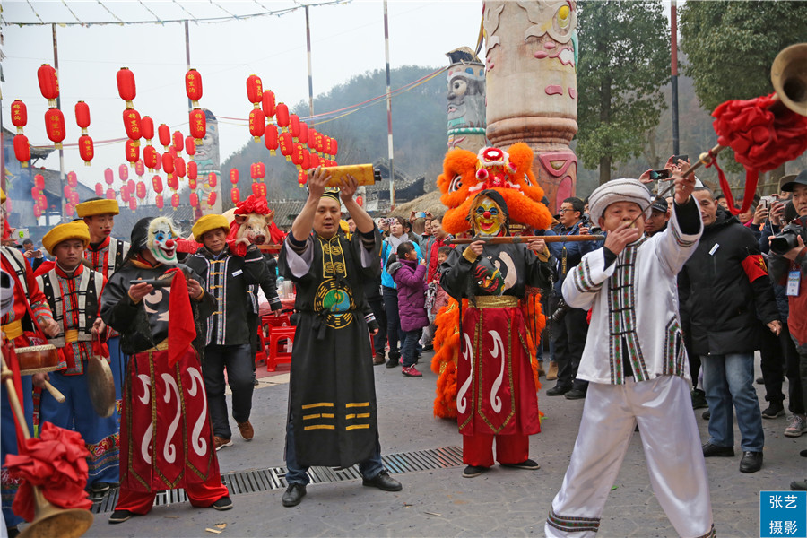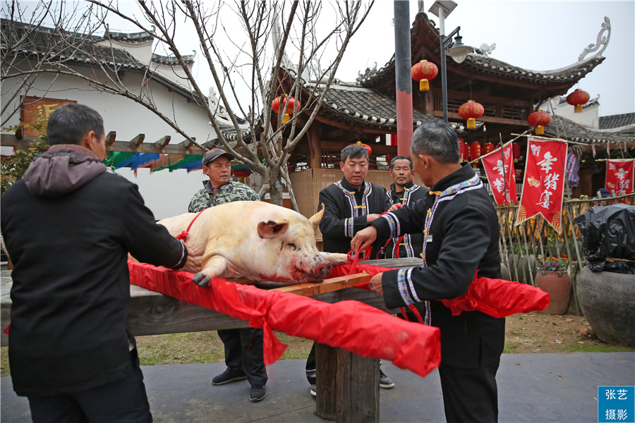 年猪宴启动仪式与众不同,上午11时许,身着特色民族服装的土家汉子,抬着披着红花的年猪登场,祈祷来年五谷丰登、山水兴旺,难得一见的场面,引得游客纷纷聚拢拍照。