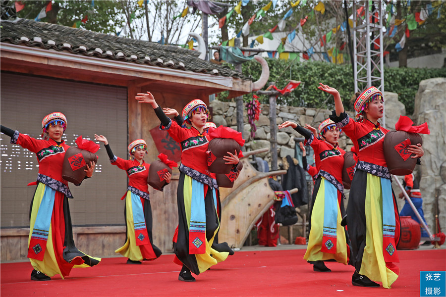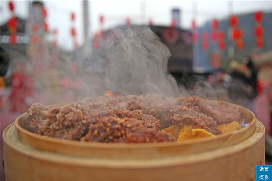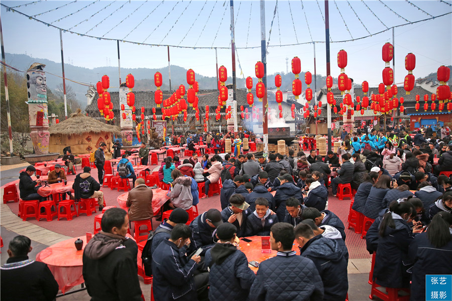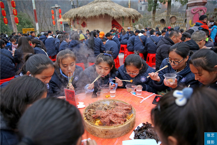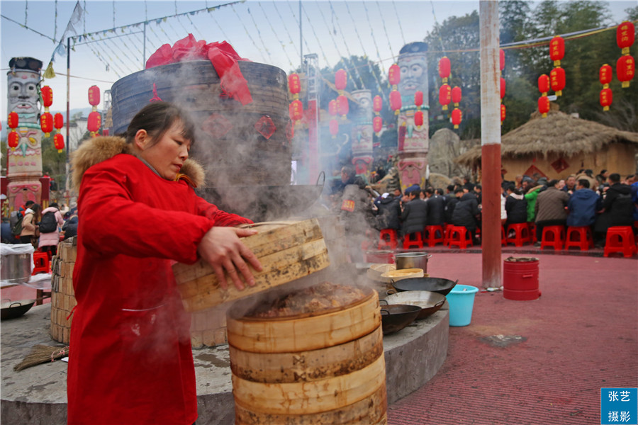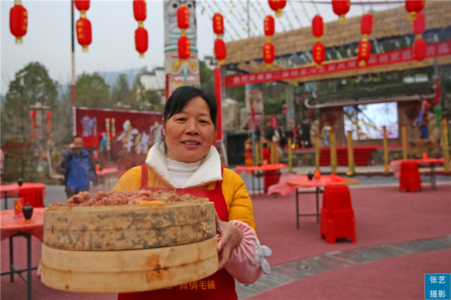 锦里沟是土家族忠峒土司第十七代土司王在清朝雍正年间从鄂西恩施迁来,至今已有300多年历史,留下子大量土家山寨,一直保留着鲜明的土家文化色彩,成为鄂东地区一道靓丽的文化名片。图为万人年猪宴的服务员喜气洋洋的端着两屉粉蒸肉。