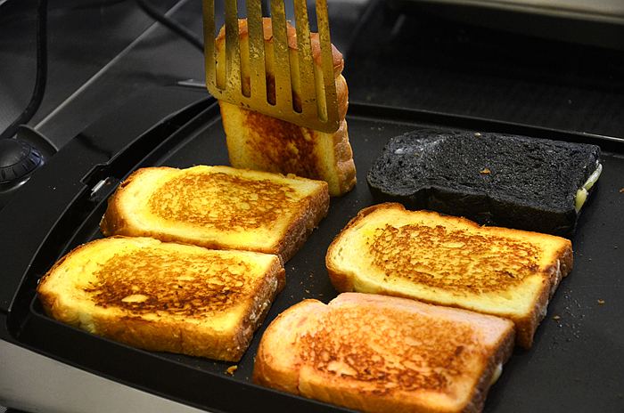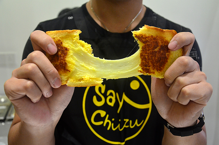 香喷喷热乎乎的芝士吐司做好啦,共有六种口味的,小哥哥会贴心的提示,要趁热吃才更好吃哦!一口咬下,面包酥脆中带着松软,芝士柔软中带着筋道,香甜美味,让人爱不释手。