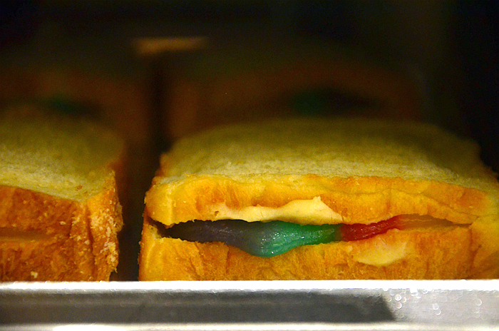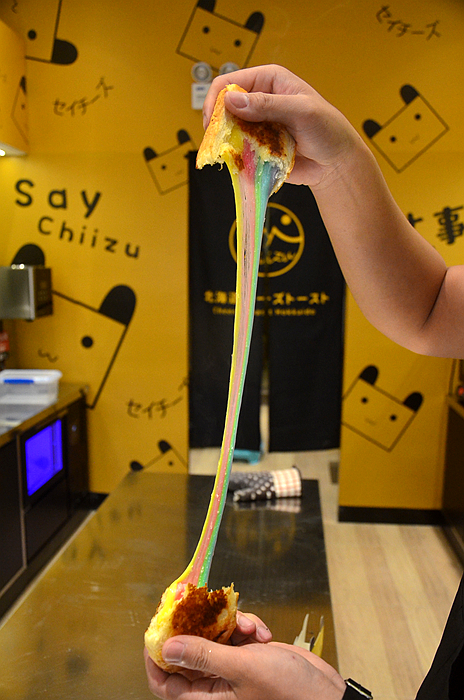小彩云口味的芝士吐司里面的芝士是彩虹色的,拉起来更是漂亮,仿佛一道炫目的彩虹!